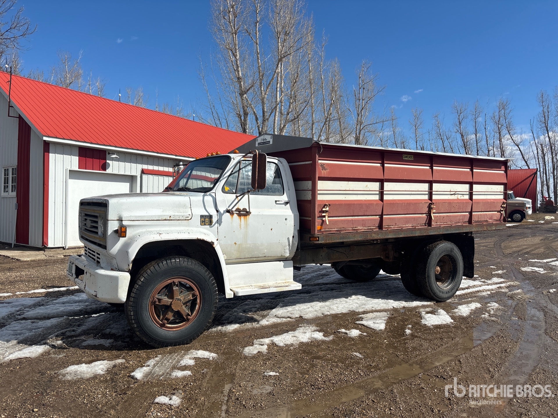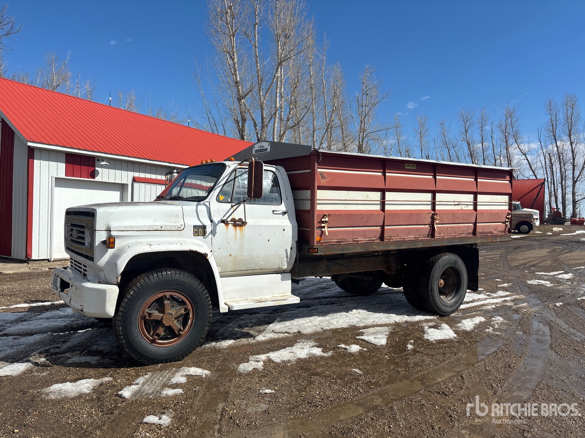 V8 Gasoline Engine, 5/2 Manual Transmission, 5000 lb Front Axle, 16160 lb Rears, 21160 lb GVWR, 9.00-20 Front Tires, 10R22.5 Rear Tires, Spring Suspension, 180 in Wheelbase, PTO, Cancade 15 ft Long x 46 in High Steel Body, Manual Roll Tarp, Split Swing Tailgate