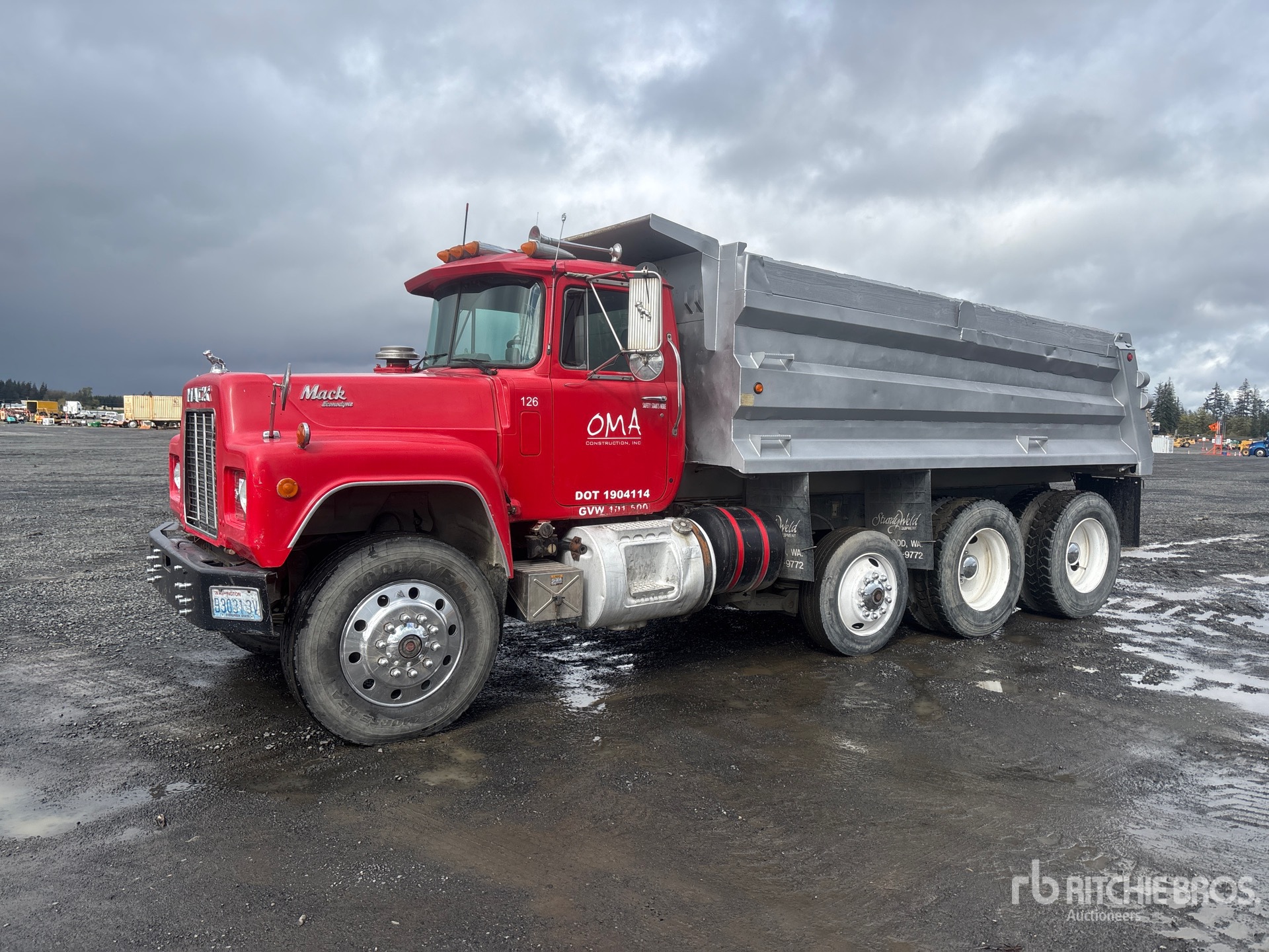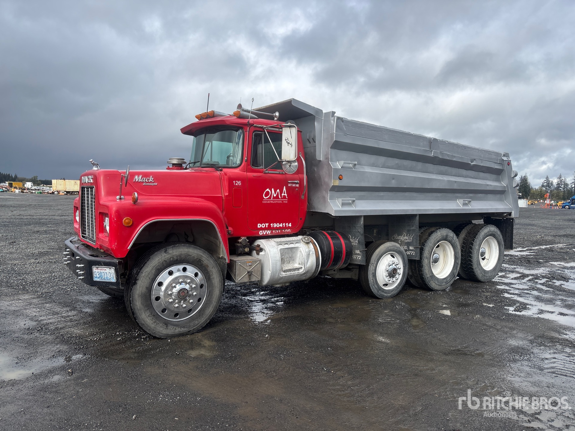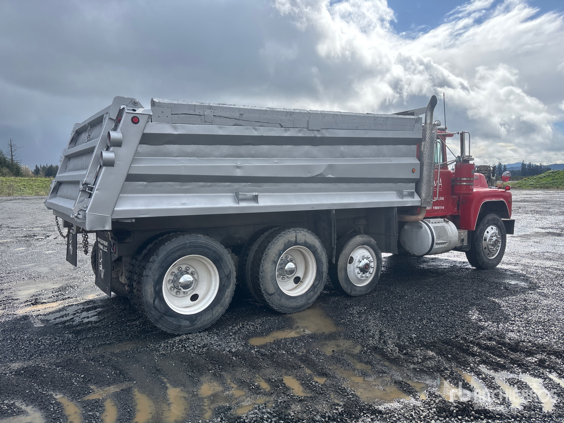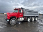 Mack 6 Cylinder Diesel Engine, Engine Brake, Mack Maxitorque T2130 13-Speed Manual Transmission, Aluminum Front Wheels, 11R24.5, Spring Suspension, 212 in Wheelbase, PTO, Sturdyweld 16 ft Long x 3 ft High Steel Body, 12 cyd, Capacity, Rear Hydraulics, Pintle Hitch