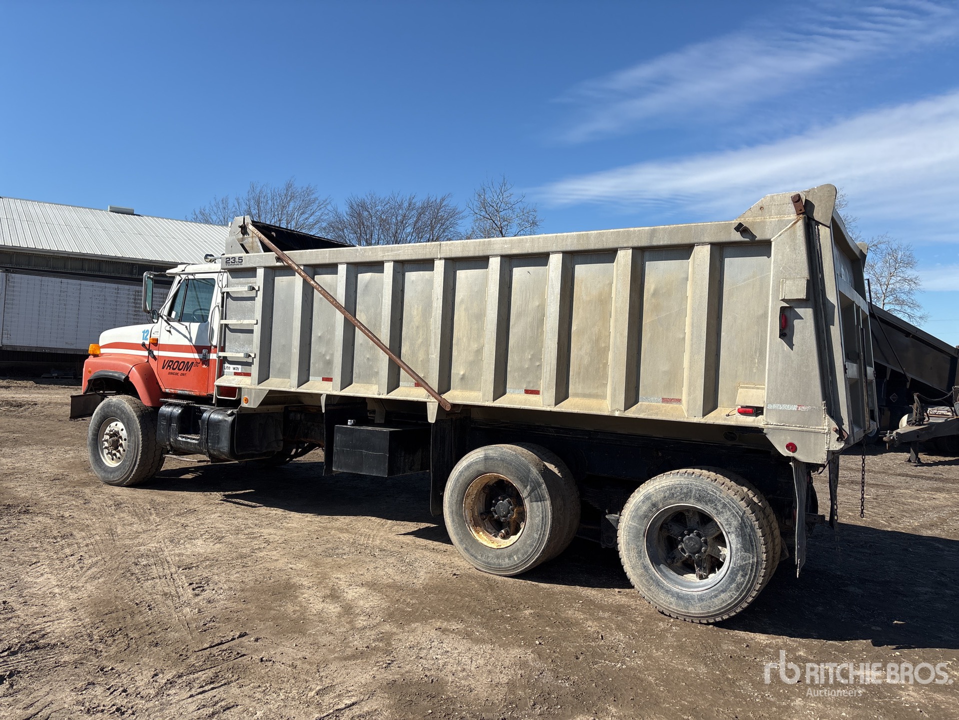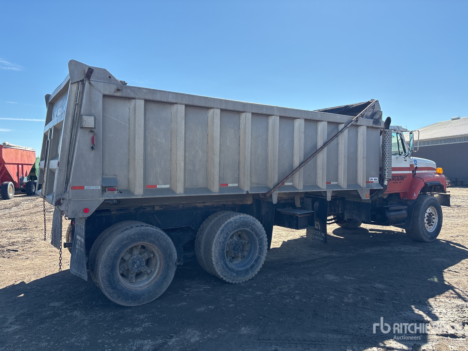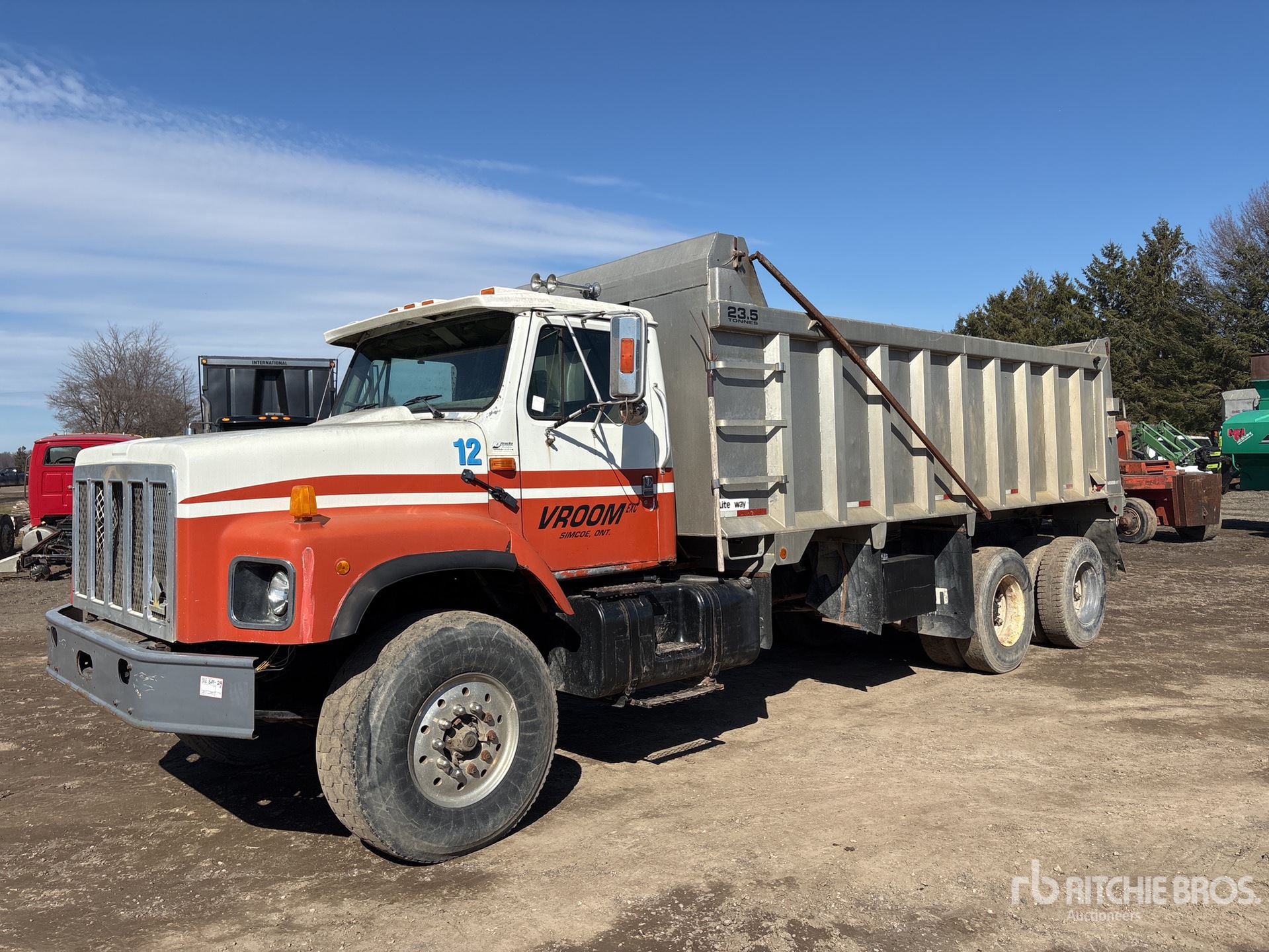 Cummins 6 Cylinder Diesel Engine, 29450 Engine hrs, Eaton Fuller Manual Transmission, 8410 kg Front Axle, 19232 kg Rears, 27642 kg GVWR, Aluminum Front Wheels, 425/65R22.5 Front Tires, 11R22.5 Rear Tires, Dual Steering Boxes, Double Frame, Hendrickson Spring over Walking Beam Suspension, 240 in Wheelbase, PTO, Lite Way 19 ft 6 in Long x 4 ft 6 in High Aluminium Body, Air Powered Roll Tarp, Tailgate Chute