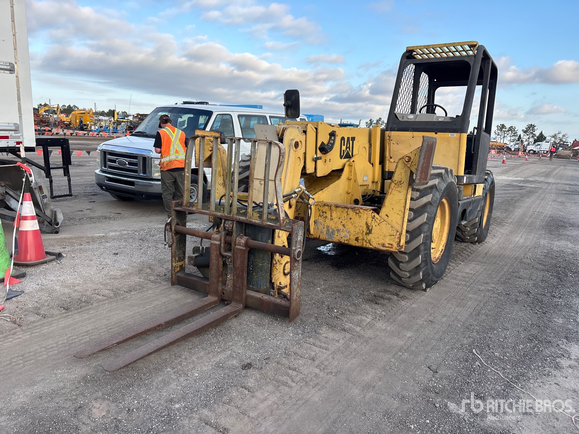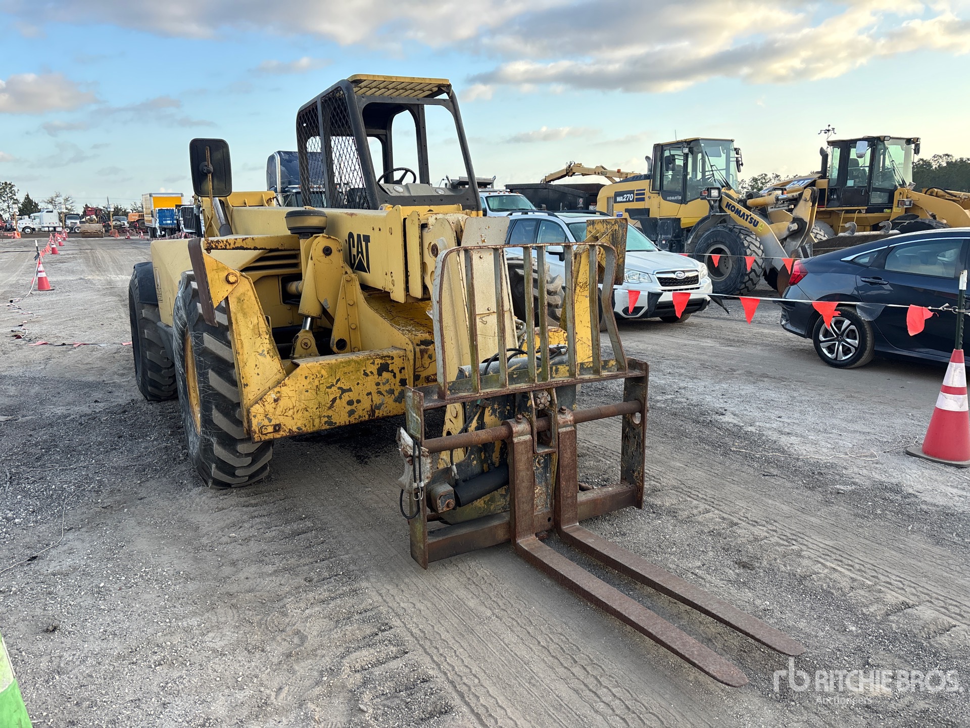 Located in Lane 206 Spot 1, Open Operator Station, 44 ft Max Lift Height, 10000 lb Max Lift Capacity, 1997 US EPA Label, 48 in Forks, Tilt Carriage, Outriggers, Frame Leveling, Auxiliary Hydraulic Plumbing, 14.00-24 Tires