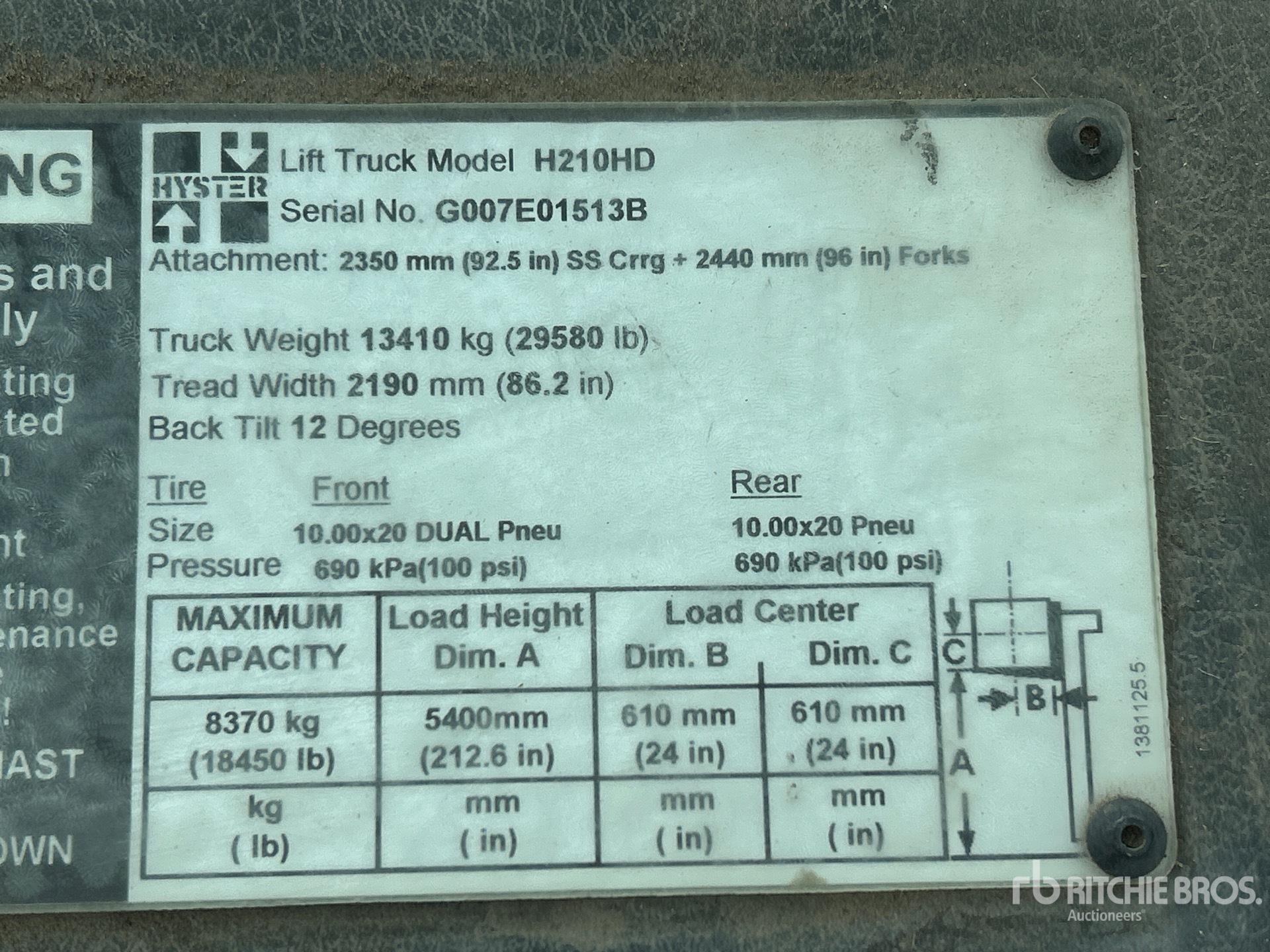 De gedetailleerde informatie over het materieel is beperkt, en Ritchie Bros. Auctioneers heeft geen andere aspecten of onderdelen van het materieel geïnspecteerd dan uitdrukkelijk in dit document vermeld. Tenzij uitdrukkelijk vermeld, geven wij geen verklaringen of garanties, expliciet of impliciet, met betrekking tot het materieel of de onderdelen ervan, met inbegrip van, maar niet beperkt tot, verklaringen of garanties met betrekking tot functionaliteit, conformiteit of naleving van veiligheidsnormen of -vereisten van een toepasselijke autoriteit of regelgevende instantie, geschiktheid voor een bepaald doel of verkoopbaarheid. U wordt ten zeerste aangeraden uw eigen gedetailleerde inspectie van het materieel uit te voeren voordat u een bod plaatst.