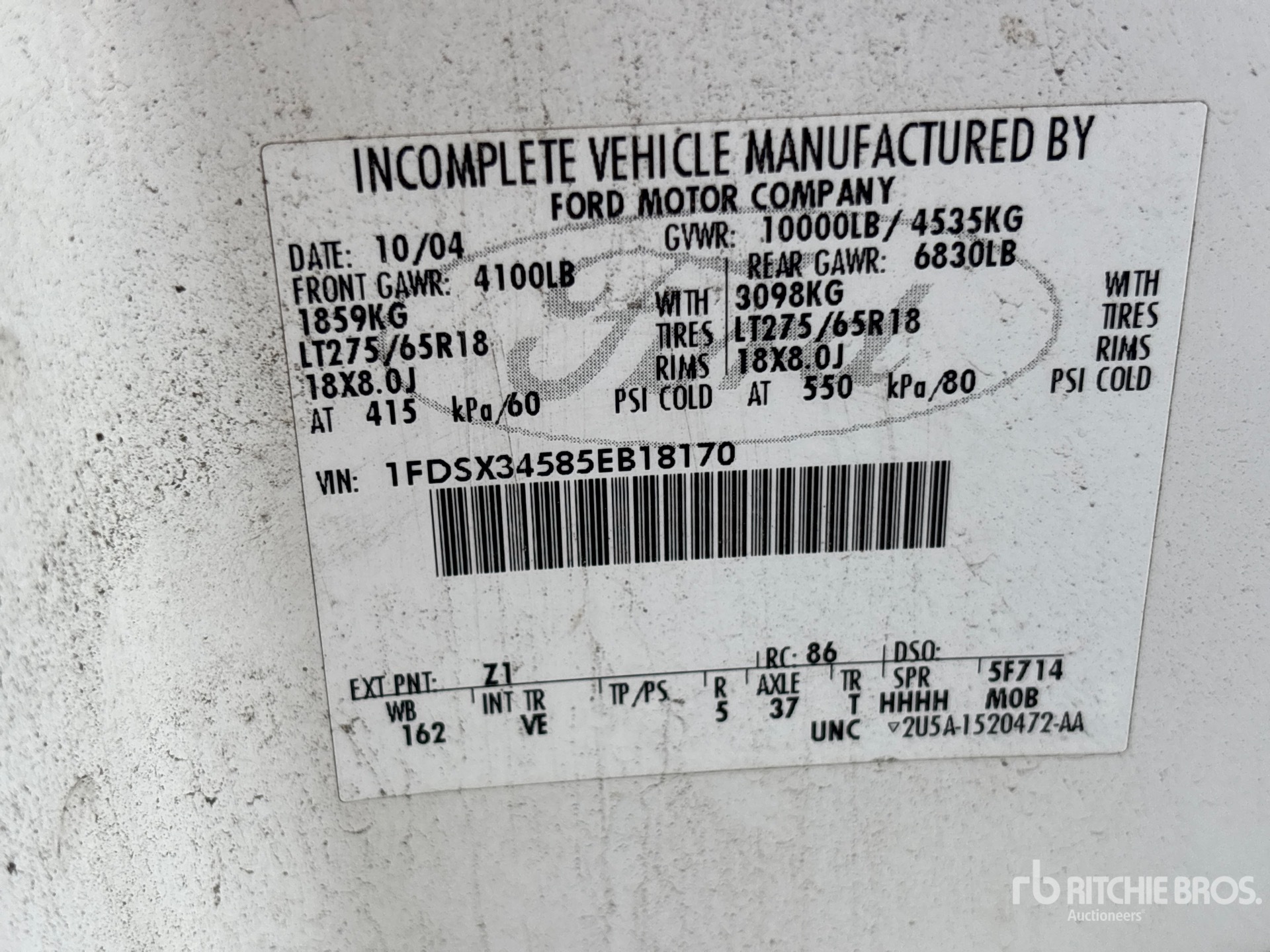 Located in Lane 24 Spot 2, V8 5.4 L Gasoline Engine, 2005 US EPA Label, Automatic Transmission, 4100 lb Front Axle, 6830 lb Rears, 10000 lb GVWR, 275/65R18 Front Tires, 235/85R16 Rear Tires, Spring Suspension, 162 in Wheelbase, Marathon 9 ft Body, Ladder Rack
