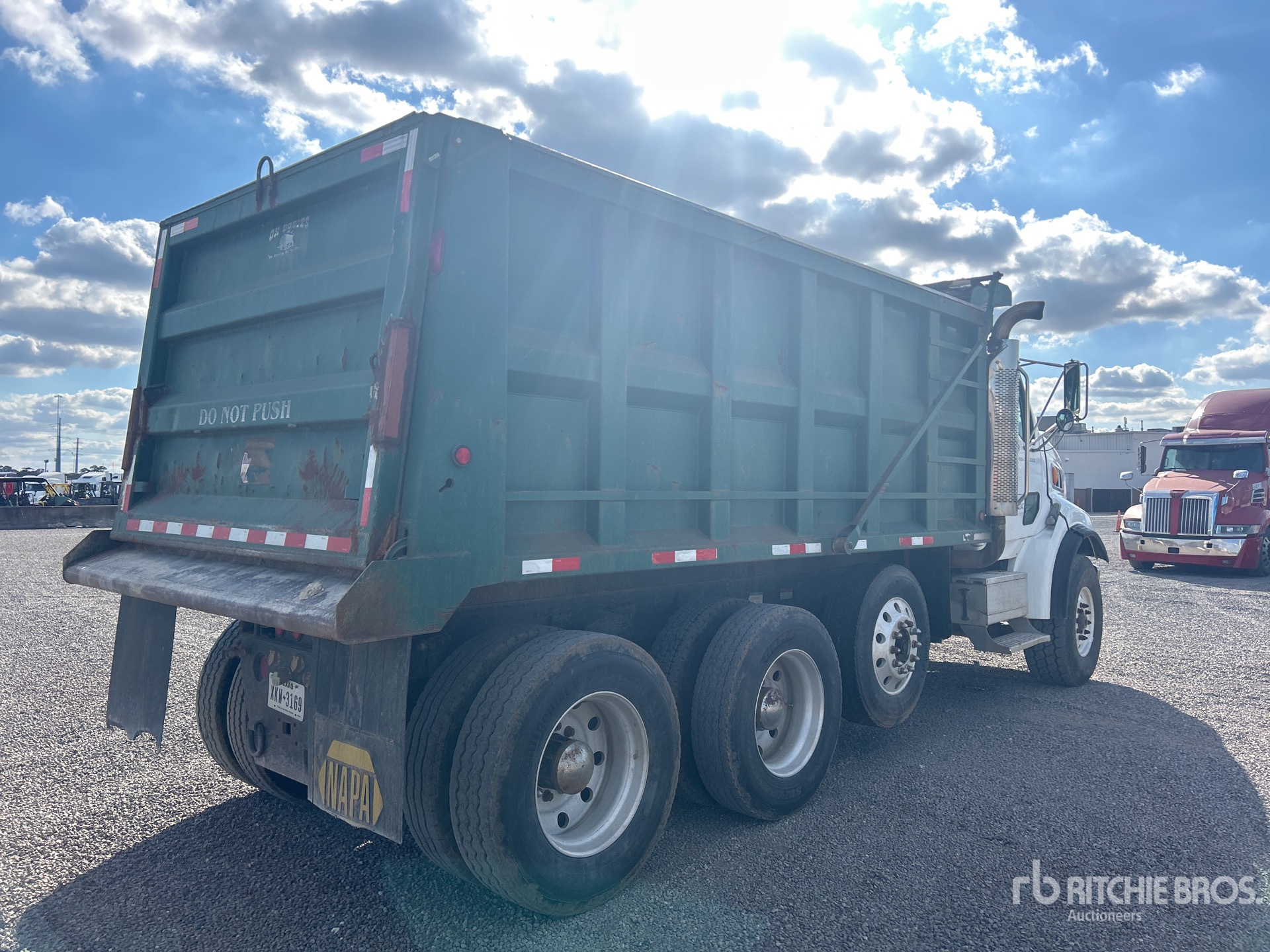 Located in Lane 33 Spot 34, 6 Cylinder Diesel Engine, Engine Brake, Allison Automatic Transmission, 20000 lb Front Axle, 46000 lb Rears, 66000 lb GVWR, Air Ride Cab, Aluminum Outer Wheels, 425/65R22.5 Front Tires, 11R24.5 Rear Tires, Steerable Air Lift Pusher Axle, Dual Steering Boxes, Double Frame, TufTrac Suspension, 205 in Wheelbase, OX Bodies 16 ft Long x 5 ft 3 in High Steel Body, Electric Roll Tarp