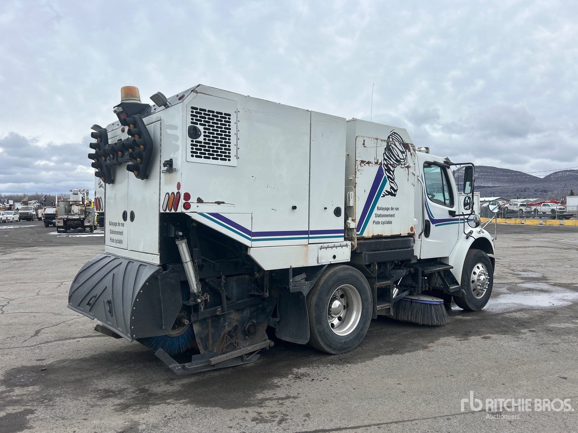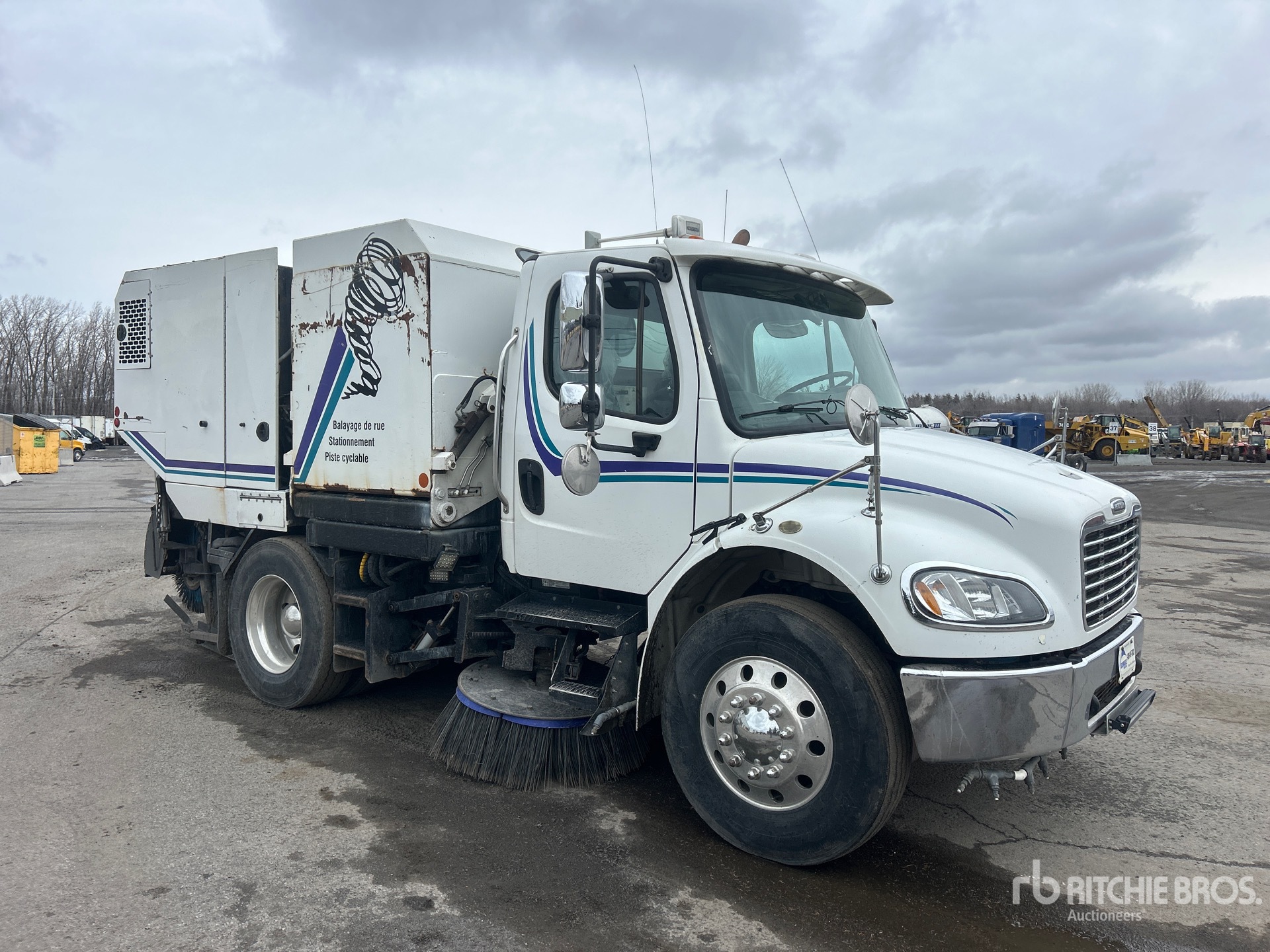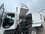 Mercedes Benz 6 Cylinder Diesel 260 hp Engine, 2006 US EPA Label, 18206 Engine hrs, Allison Automatic Transmission, 12000 lb Front Axle, 23000 lb Rears, 35000 lb GVWR, Aluminum Wheels, 11R22.5, Mechanical Broom Sweeper, Dual Controls, Front Spray Bar, 60 in, Gutter Brooms, Material Elevator, Water System, Hydraulic Dump, Rear-View Camera