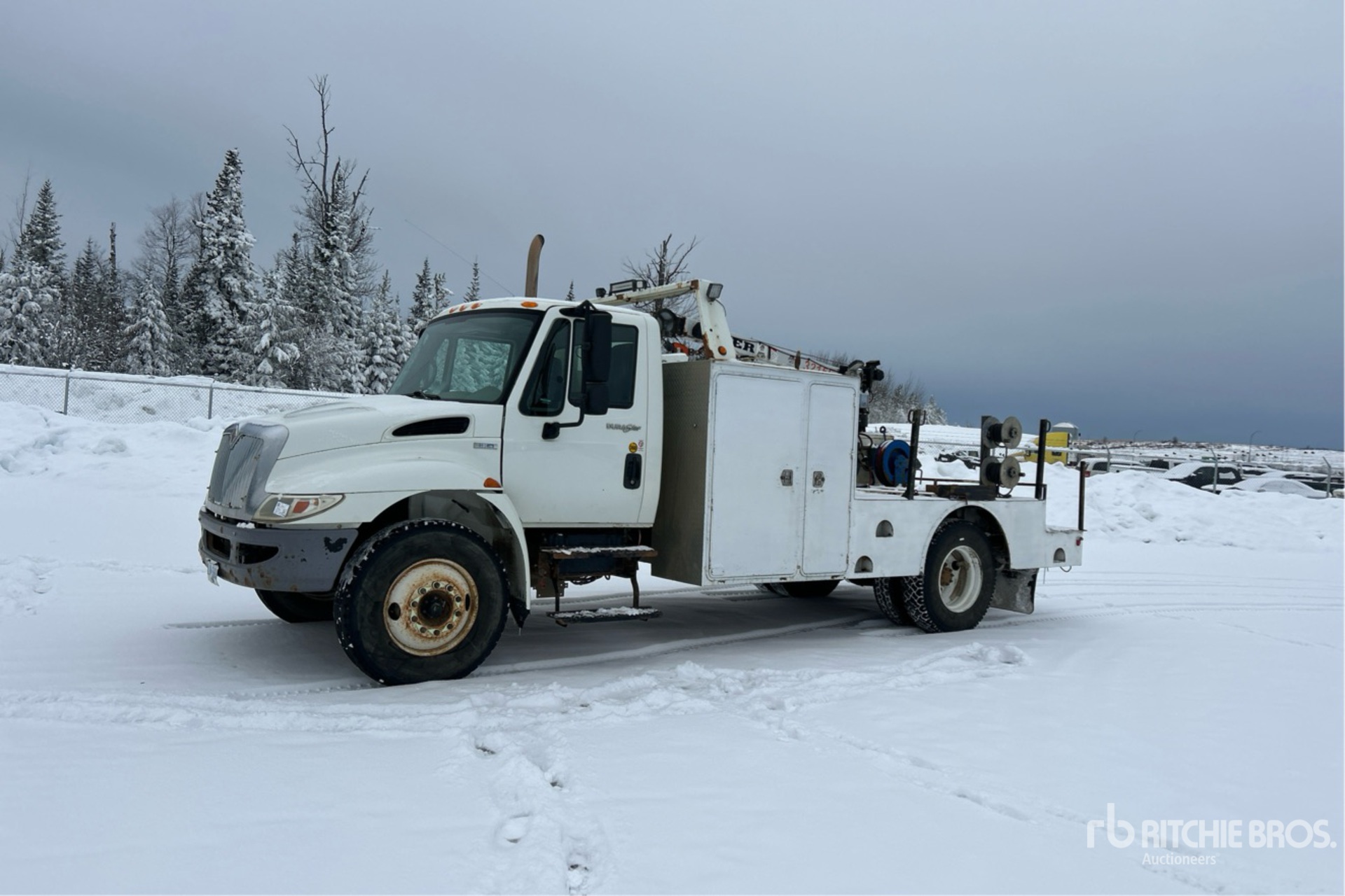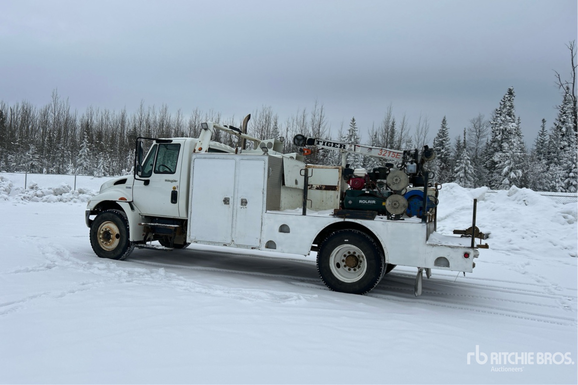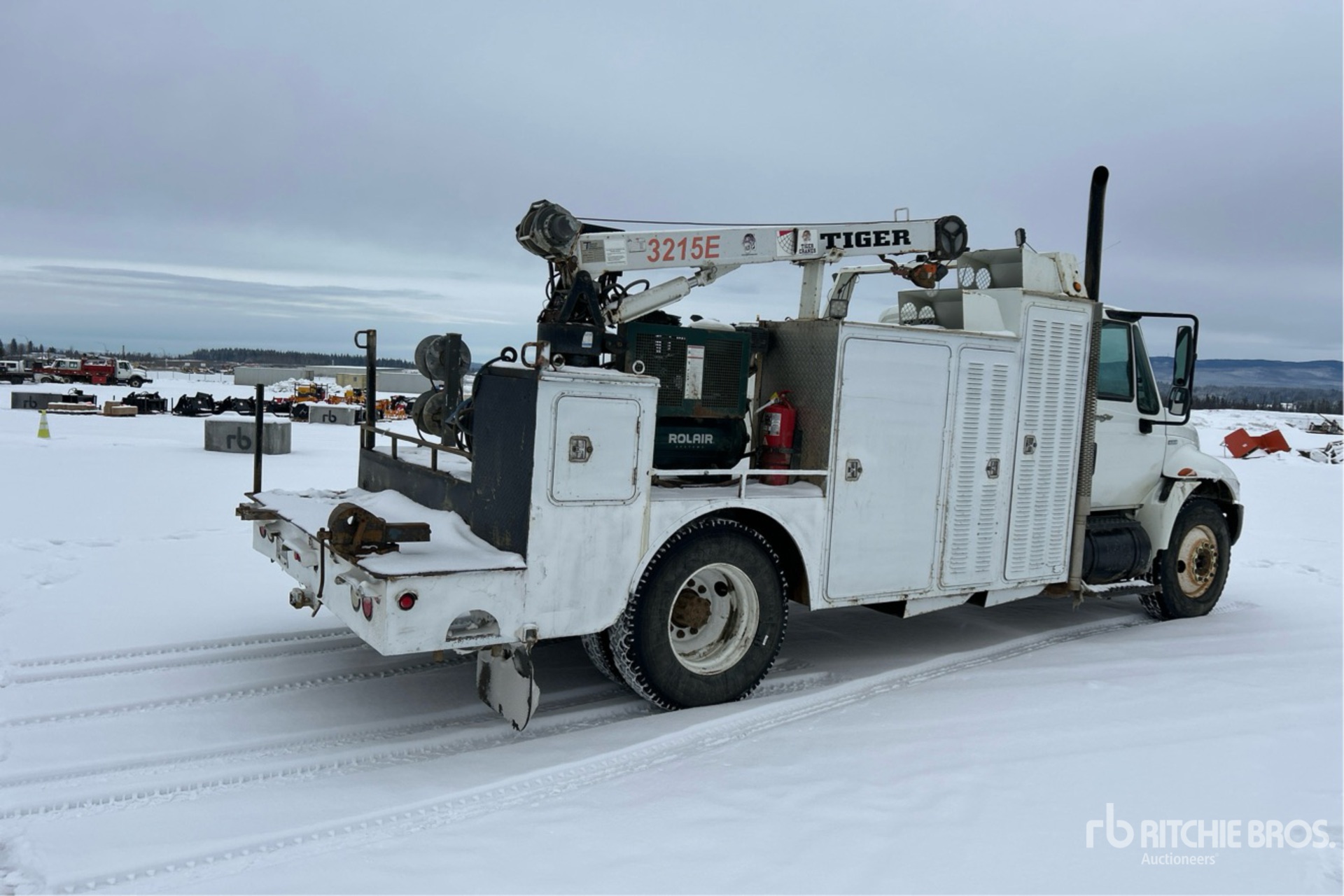 MaxxForce 7.6 L Diesel Engine, 8249 Engine hrs, Automatic Transmission, 11R22.5, Spring Suspension, 196 in Wheelbase, 16 ft Body, Tiger 3215E Crane, Rolair Air Compressor