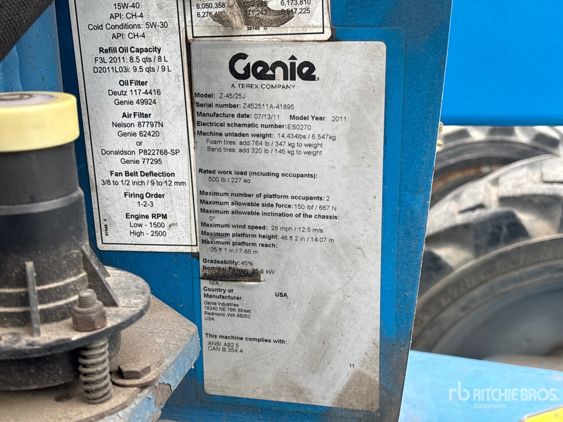 46 ft Max Platform Height, 500 lb Max Weight Capacity, Jib, Power to Platform, 2011 US EPA Label, Deutz D2011-L03 4 Cylinder 49 hp 2.332 L Diesel Engine, 355/55D625NHS Tires