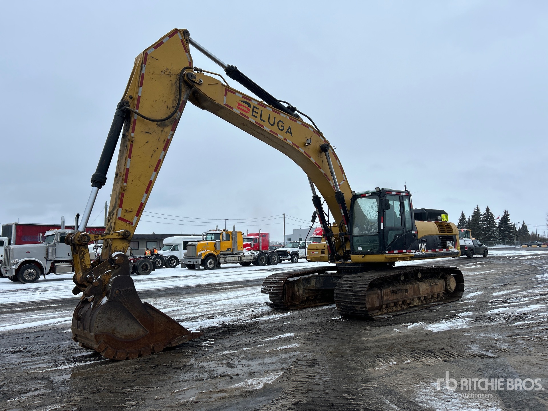 Maten worden slechts bij benadering gegeven. De werkelijke afmetingen onder belasting kunnen variëren afhankelijk van de hoogte van de vrachtwagen/aanhanger en de configuratie/positie van de geladen machine. Het is de verantwoordelijkheid van de koper om alle ladingen te meten voordat deze onze veilinglocatie verlaten, om te garanderen dat de lading veilig is voor transport. Alle maten moeten door de koper worden gecontroleerd. Vertrouw niet op deze maten voor transportdoeleinden.