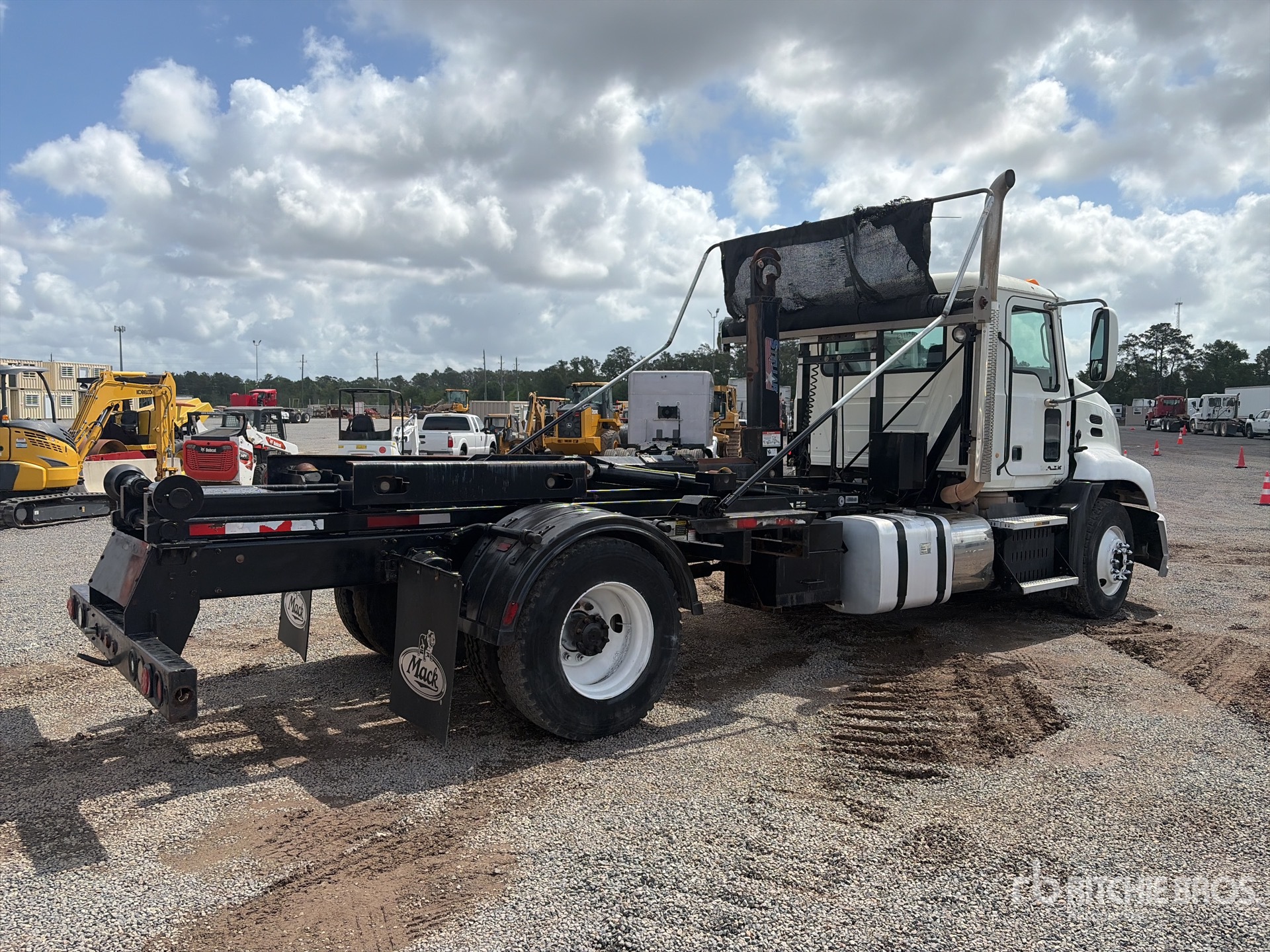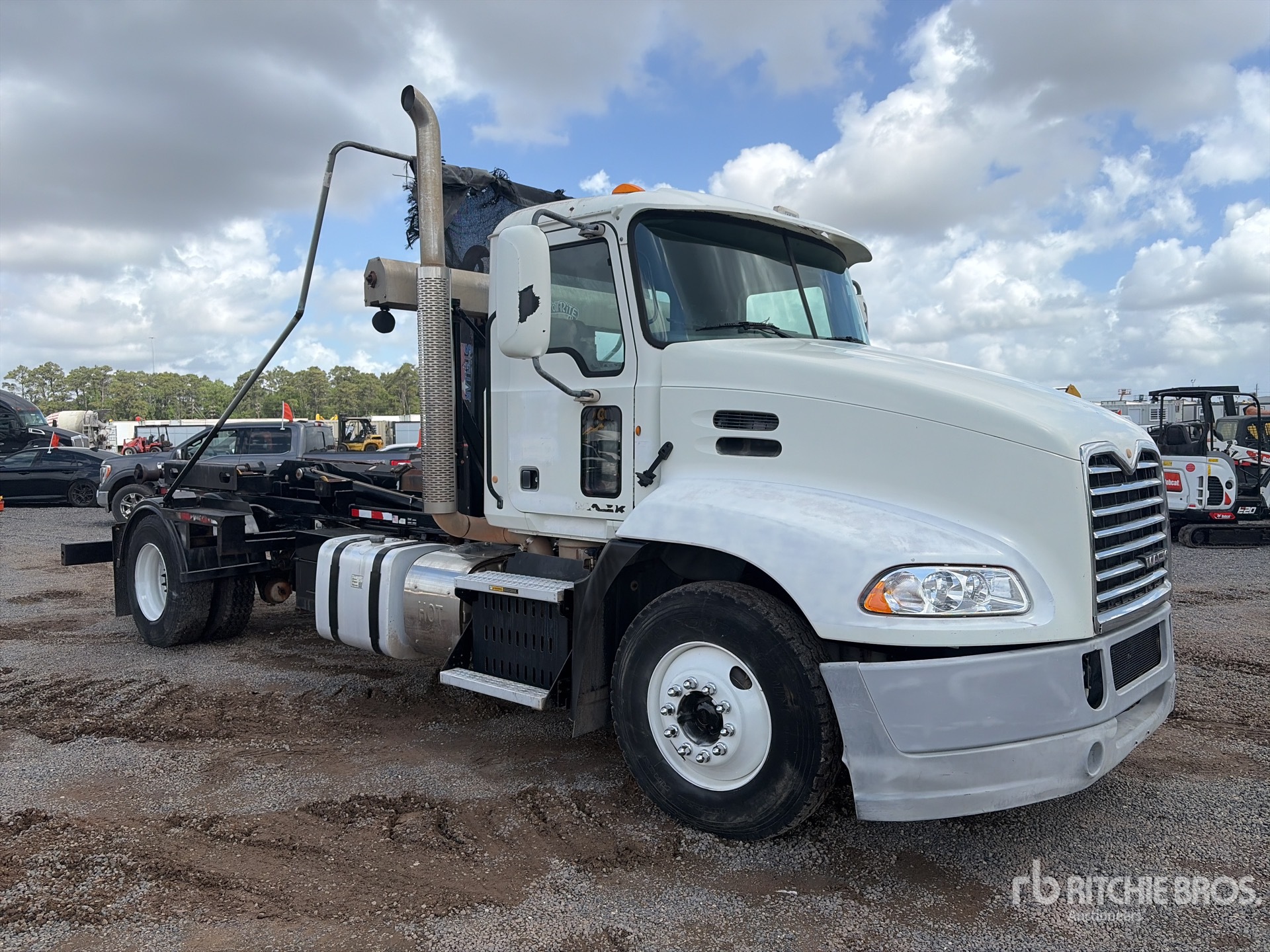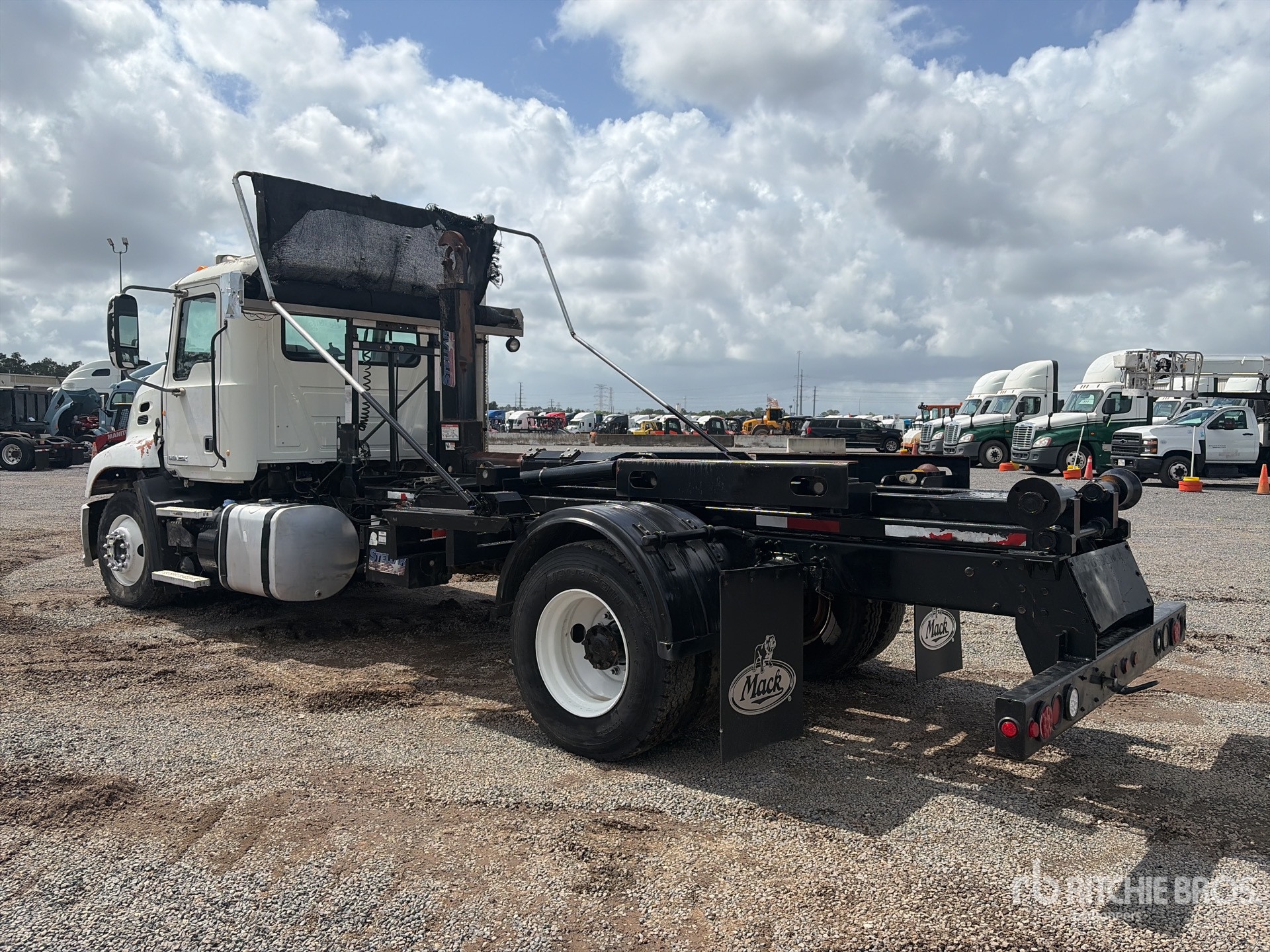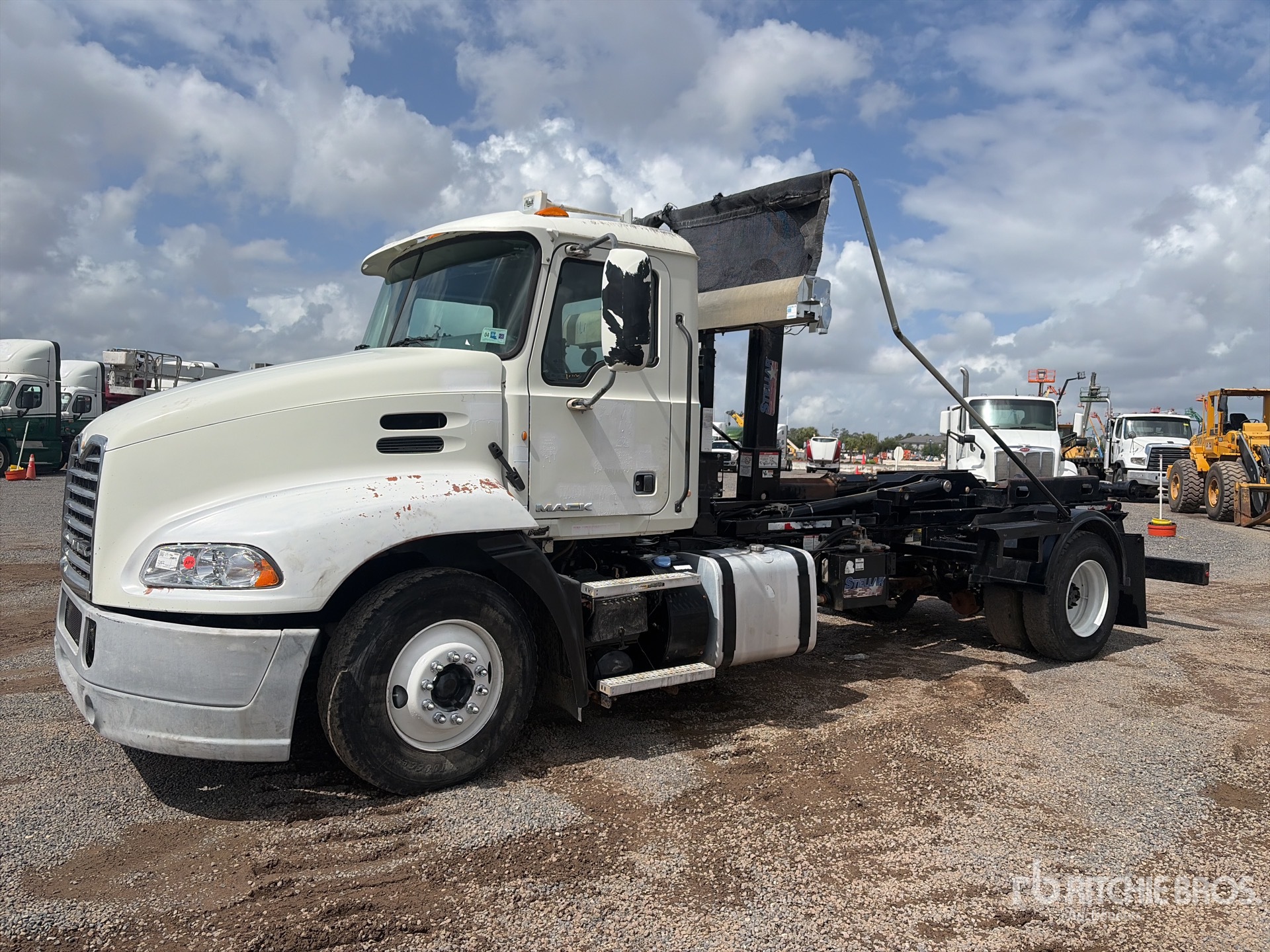 Located in Lane 36 Spot 12, Mack MP7 6 Cylinder 10.8 L Diesel 345 hp Engine, 2012 US EPA Label, 7664 Engine hrs, Engine Brake, Eaton Fuller 10-Speed Manual Transmission, 12000 lb Front Axle, 21000 lb Rears, 33000 lb GVWR, Air Ride Cab, 11R22.5, Spring Suspension, PTO, Stellar Roll-Off Body, 16 ft Hoist