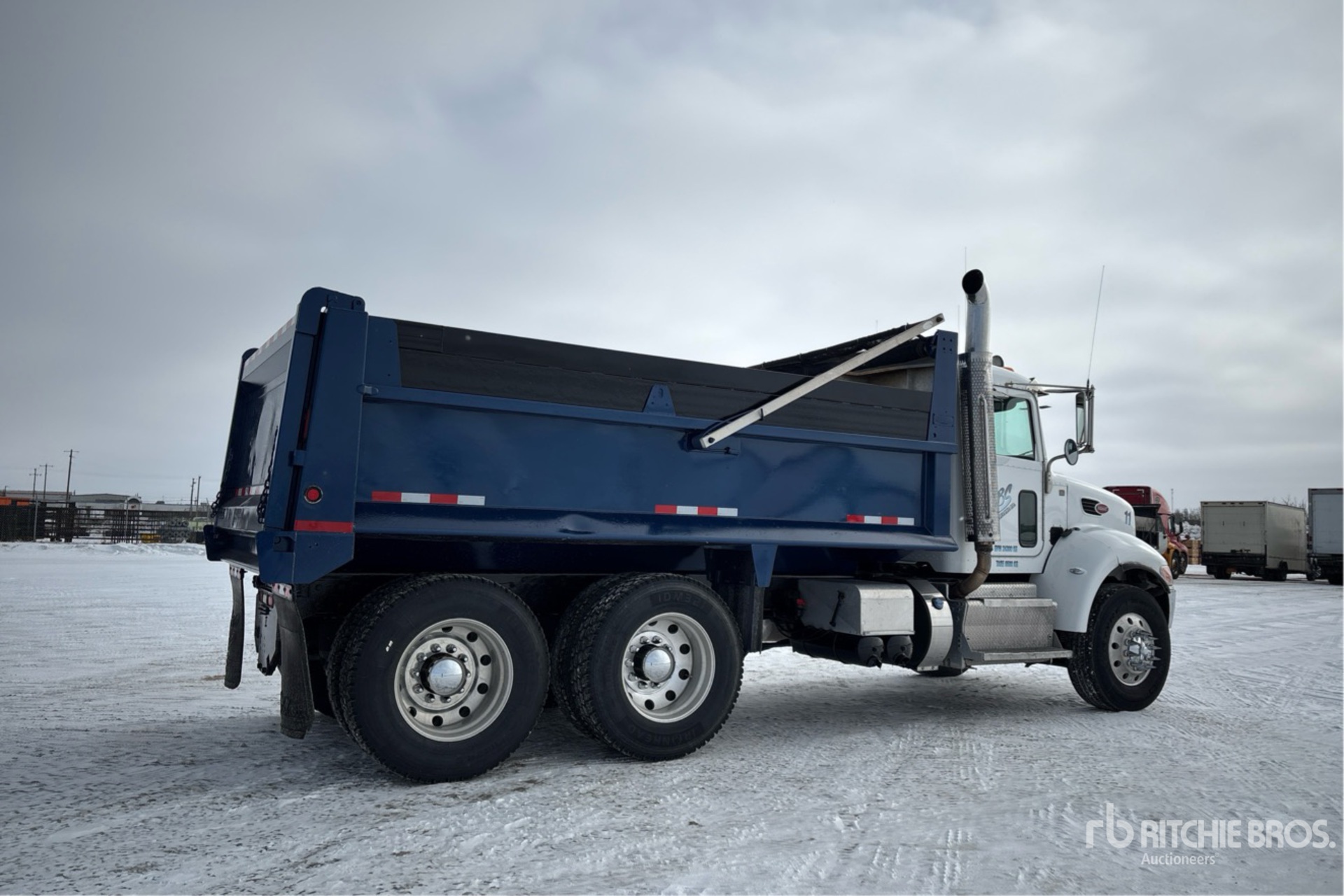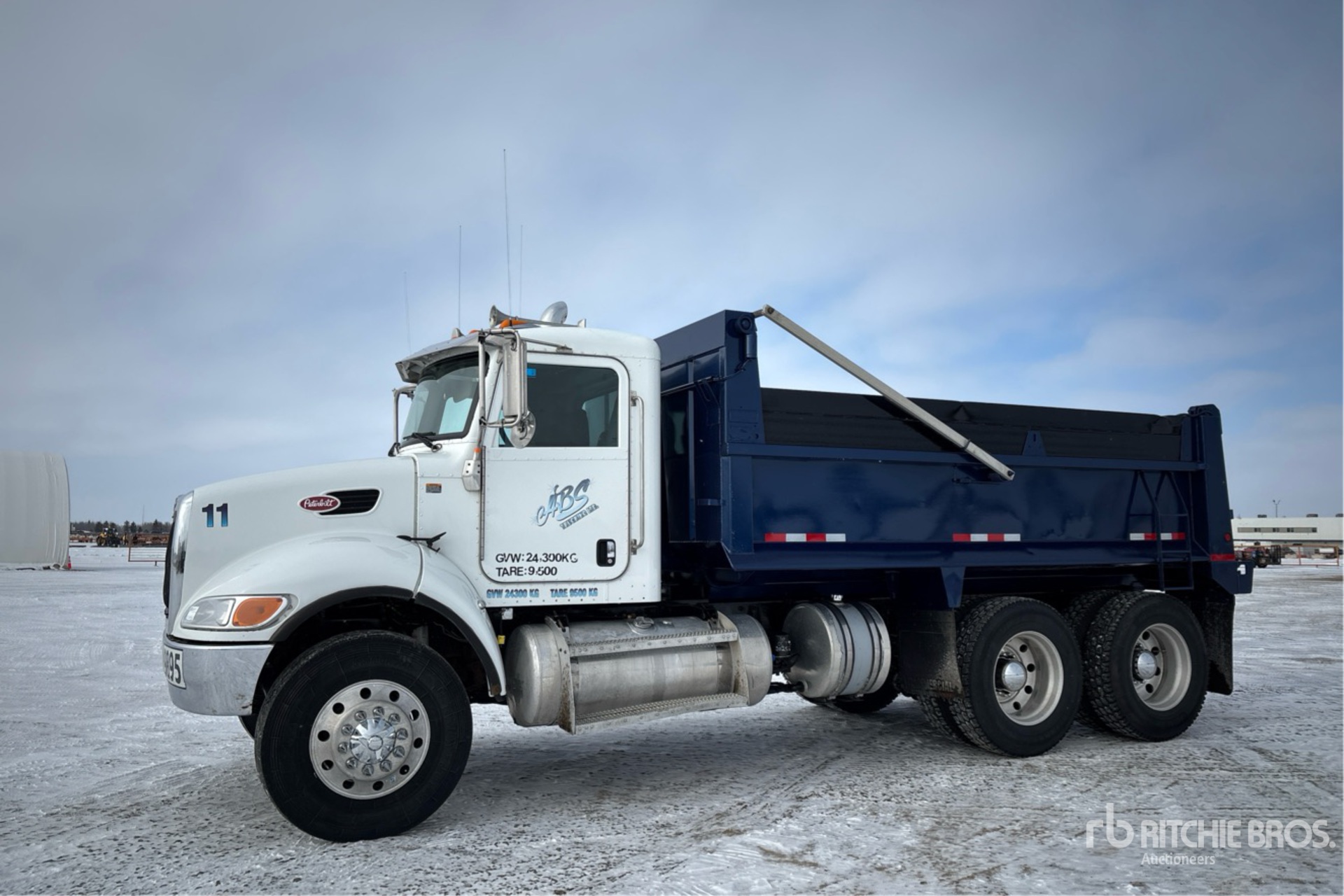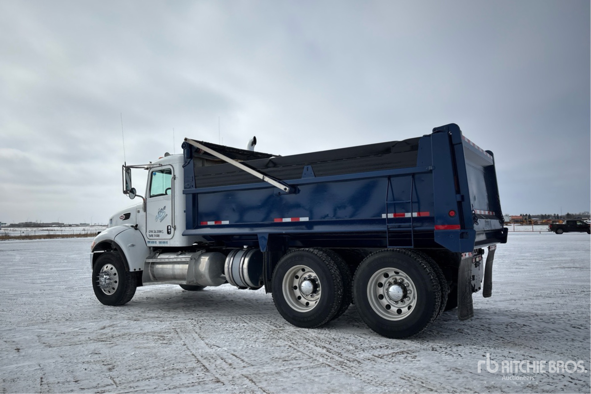 Paccar PX-9 6 Cylinder 8.9 L Diesel 330 hp Engine, 2014 US EPA Label, Positive Air Shutoff, 19067 Engine hrs, Engine Brake, Allison 3500 Automatic Transmission, Double Differential Locks, 14596 lb Front Axle, 39990 lb Rears, Spicer DSP41 Drive Axles, 5.57:1 Axle Ratio, 54586 lb GVWR, Aluminum Wheels, 315/80R22.5 Front Tires, 11R24.5 Rear Tires, Air Ride Suspension, 202 in Wheelbase, PTO, 15 ft Long x 4 ft High Steel Body, Electric Roll Tarp, Complete-Dispersal-for-ABS-Trucking