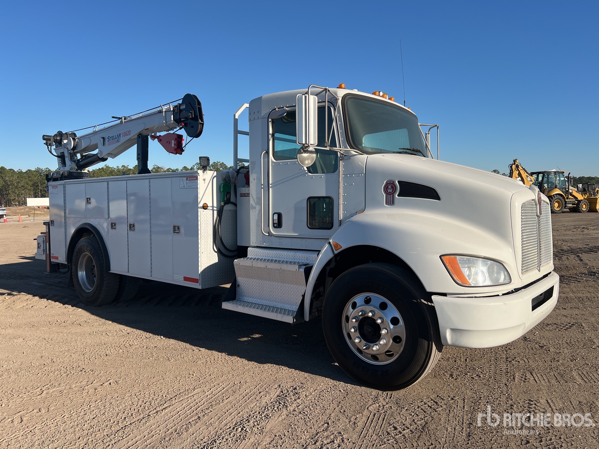 Paccar PX-7 6 Cylinder 6.7 L Diesel 260 hp Engine, 2015 US EPA Label, Requires Diesel Exhaust Fluid, 10008 Engine hrs, Engine Brake, Allison 3500 6-Speed Automatic Transmission, 13000 lb Front Axle, 20000 lb Rears, Dana P22060S Drive Axles, 5.57:1 Axle Ratio, 33000 lb GVWR, Aluminum Outer Wheels, 11R22.5, Spring Suspension, 191 in Wheelbase, PTO, Stellar 15 ft 2 in Body, Hydraulic Stabilizers, Stellar 10620 3 Section Hydraulic Crane, Wireless Remote Control, PTO Air Compressor, Air Hose Reel, Miller Trailblazer 301D 10 kW 300 A Diesel Welder