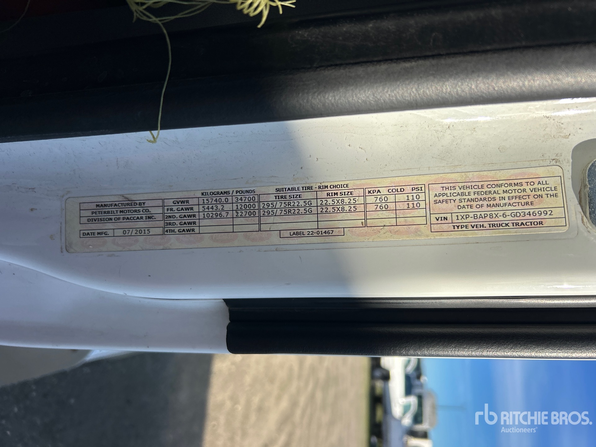 Paccar MX-13 430 hp Engine, 2015 US EPA Label, 14822 Engine hrs, Eaton Fuller 10-Speed Manual Transmission, 12000 lb Front Axle, 22700 lb Rears, 34700 lb GVWR, Engine Brake, 158 in Wheelbase, Air Suspension, Aluminum Wheels, 295/75R22.5, Dual Fuel Tanks