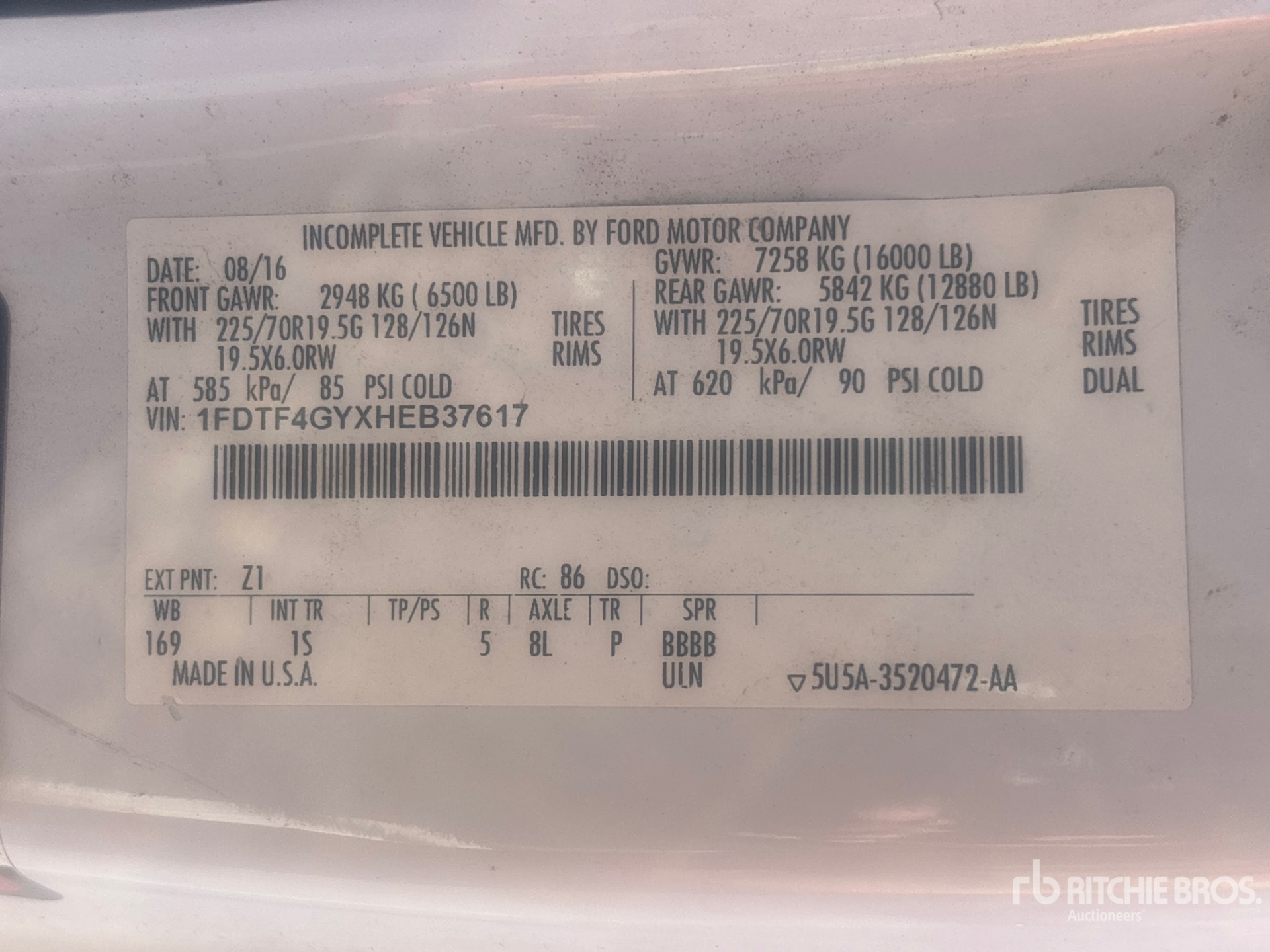 Located in Lane 23 Spot 3, Ford V8 6.8 L Gasoline Engine, 2016 US EPA Label, Automatic Transmission, 6500 lb Front Axle, 12880 lb Rears, 16000 lb GVWR, 225/70R19.5 Front Tires, 225/70R19.5 Rear Tires, Spring Suspension, 170 in Wheelbase, 12 ft x 96 in Bed