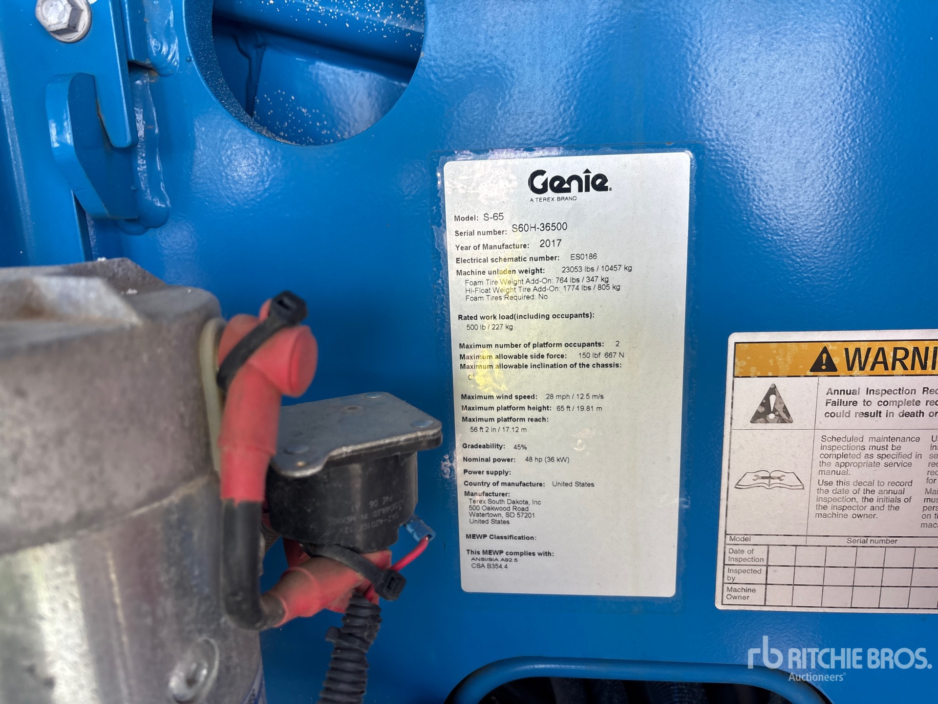 65 ft Max Platform Height, 500 lb Max Weight Capacity, Jib, Power to Platform, Onboard Generator, 2016 US EPA Label, Deutz D2.9 4 Cylinder Diesel Engine, 355/55DD625 Tires