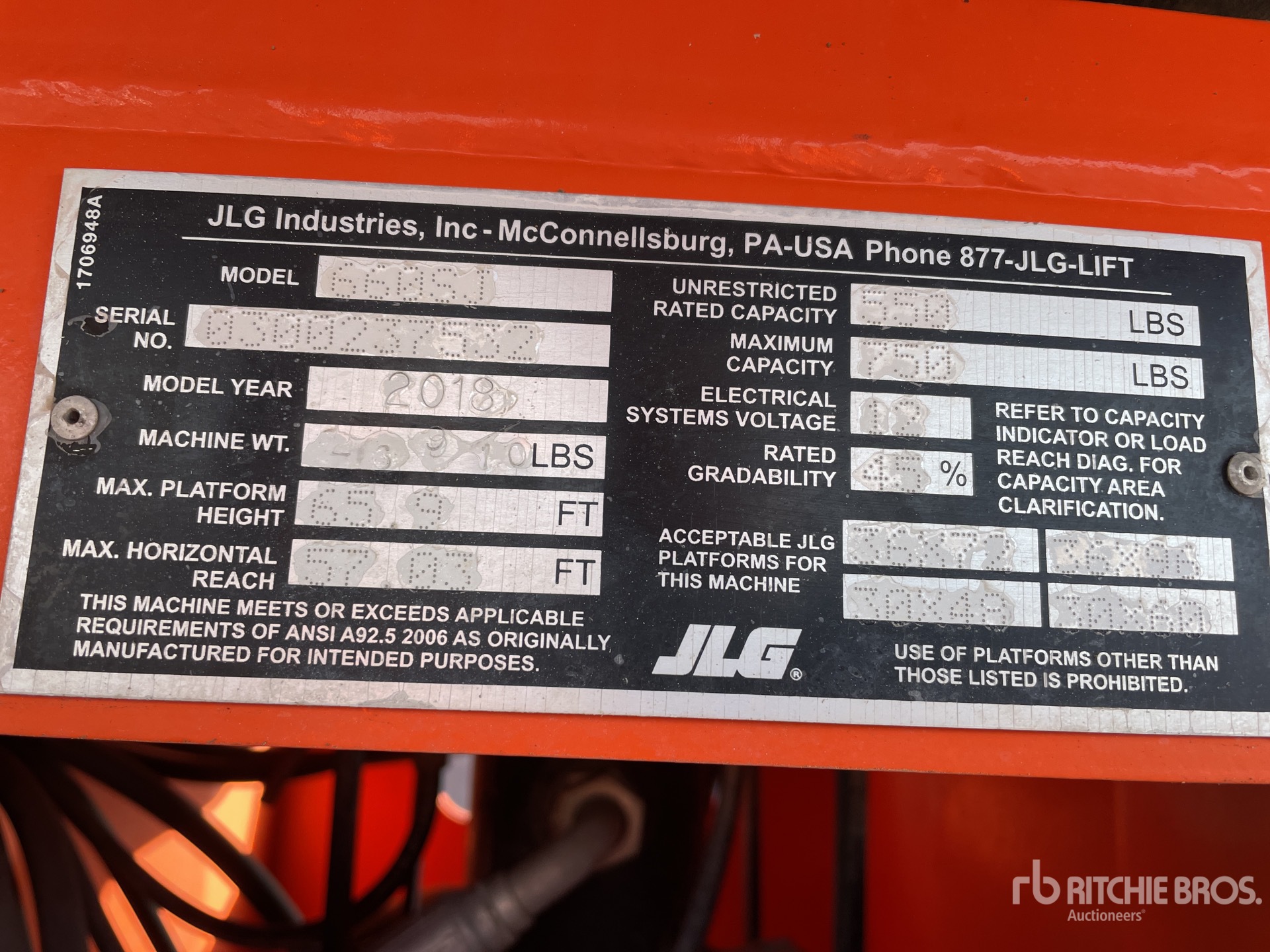 65 ft 9 in Max Platform Height, 750 lb Max Weight Capacity, 2017 US EPA Label, Deutz TD 2.9 L4 67 hp 2.9 L Diesel Engine, 355/55D625 Tires