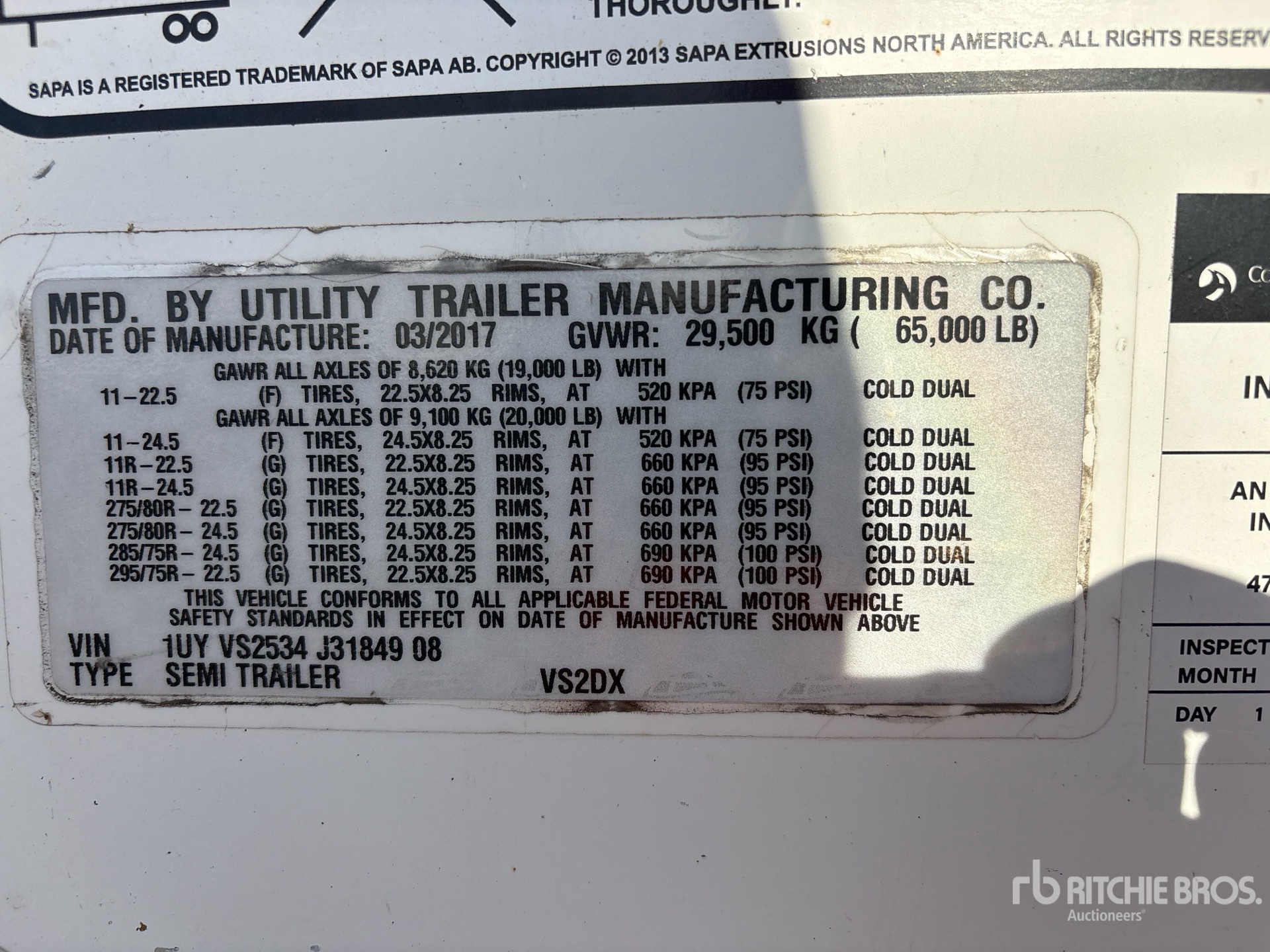 Located in Spot 13, Air Ride Sliding Suspension, Side Skirts, Hardwood Floor, Swing Door, 295/75R22.5 Tires 65000 lb GVWR