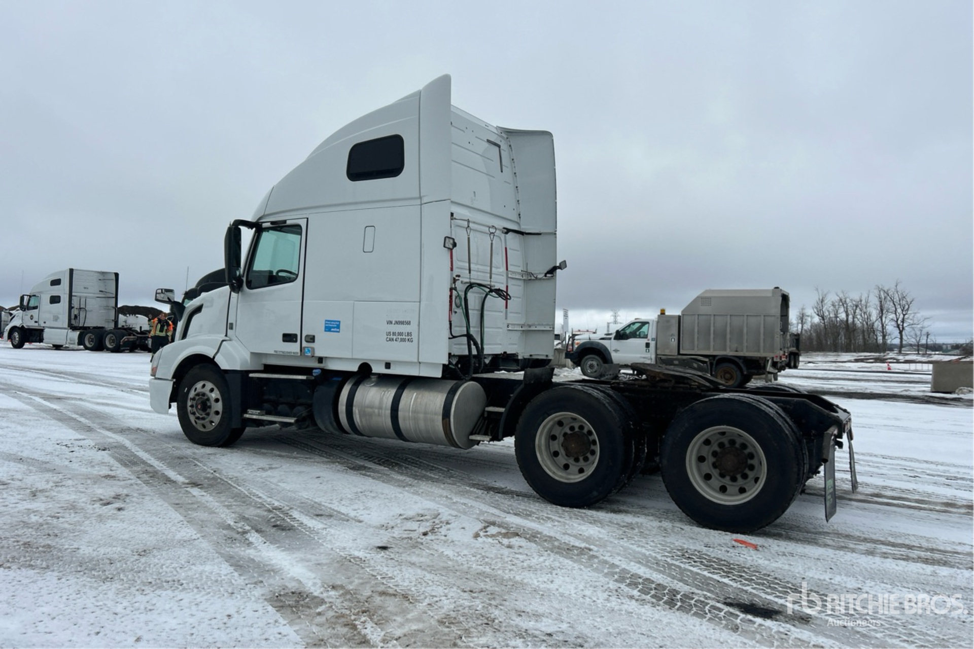 Located in Lane 31 Spot 21, Volvo D13M 425 hp Engine, 2017 US EPA Label, 14497 Engine hrs, Volvo AT2612F 12-Speed Automated Transmission, 12500 lb Front Axle, 40000 lb Rears, 52500 lb GVWR, Engine Brake, 61 in High Rise Sleeper Cab, Bunk Beds, 210 in Wheelbase, Air Suspension, Aluminum Wheels, 11R22.5, Air Sliding 5th Wheel, Dual Fuel Tanks