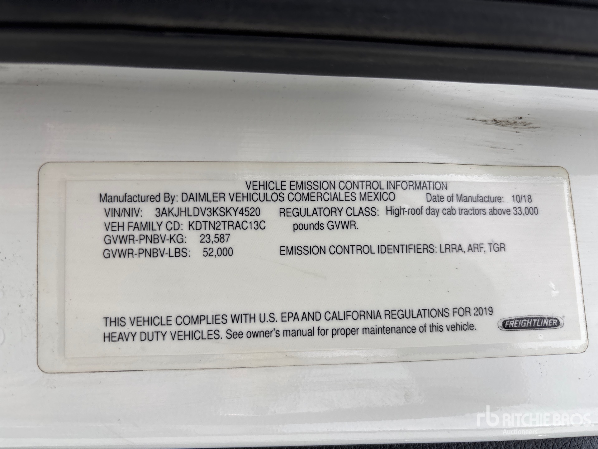 Detroit DD13 435 hp Engine, 2018 US EPA Label, 2987 Engine hrs, Detroit DT12-1550-OH1 12-Speed Automated Transmission, 12000 lb Front Axle, 40000 lb Rears, 52000 lb GVWR, Engine Brake, 178 in Wheelbase, Air Suspension, Aluminum Wheels, 11R22.5, Air Sliding 5th Wheel, Dual Fuel Tanks