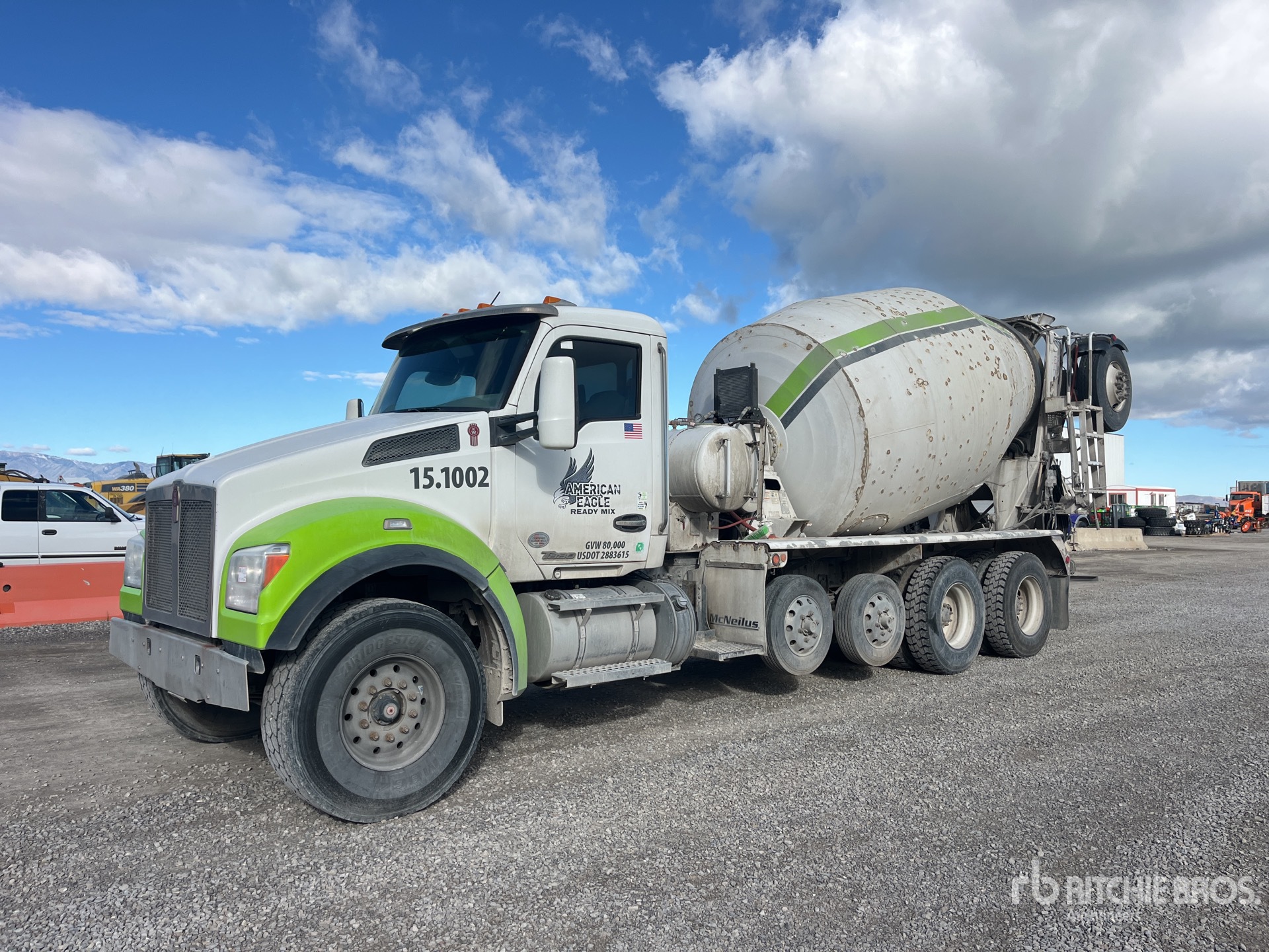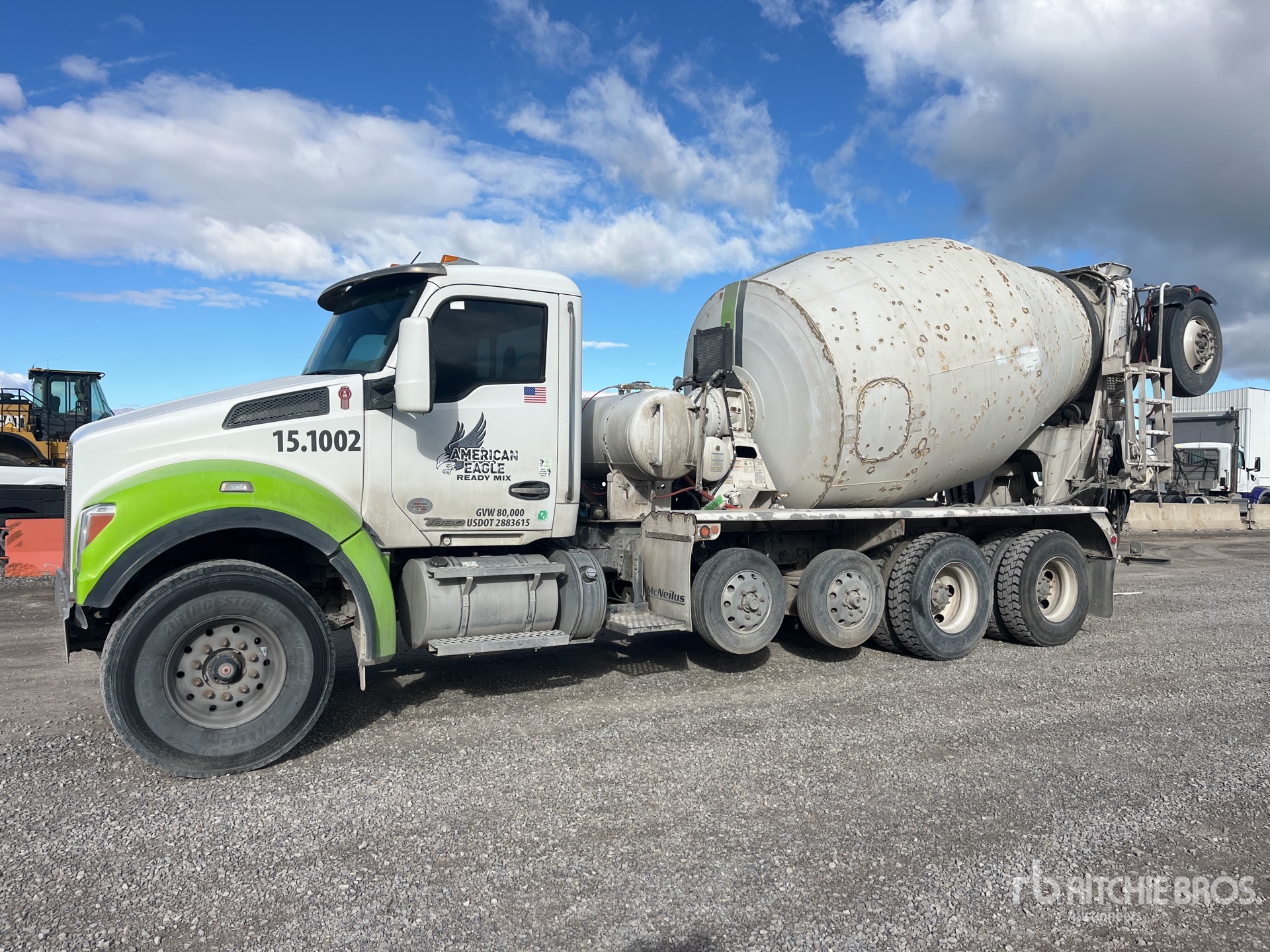 Paccar 6 Cylinder Diesel Engine, Requires Diesel Exhaust Fluid, 11840 Engine hrs, Engine Brake, Eaton Fuller RTO-16909ALL 9-Speed Manual Transmission, Double Differential Locks, 20000 lb Front Axle, 46000 lb Rears, Meritor RT-46-160 Drive Axles, 4.89:1 Axle Ratio, 66000 lb GVWR, Air Ride Cab, 425/65R22.5 Front Tires, 11R22.5 Rear Tires, 2 Air Lift Pusher Axles, Trailing Tag Axle, Chalmers Suspension, 252 in Wheelbase, PTO, McNeilus 12 cyd Mixer Unit, 3 Removable Chutes, Remote Control w/Cord