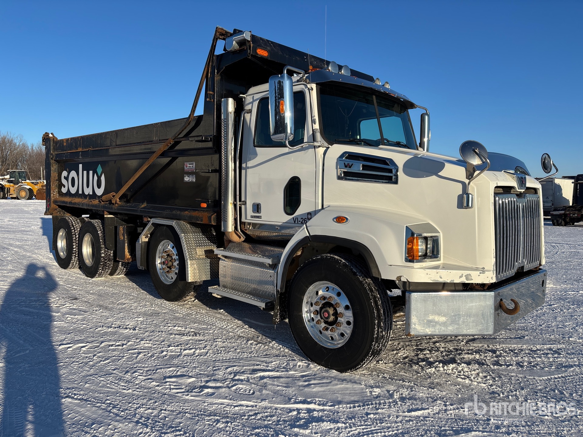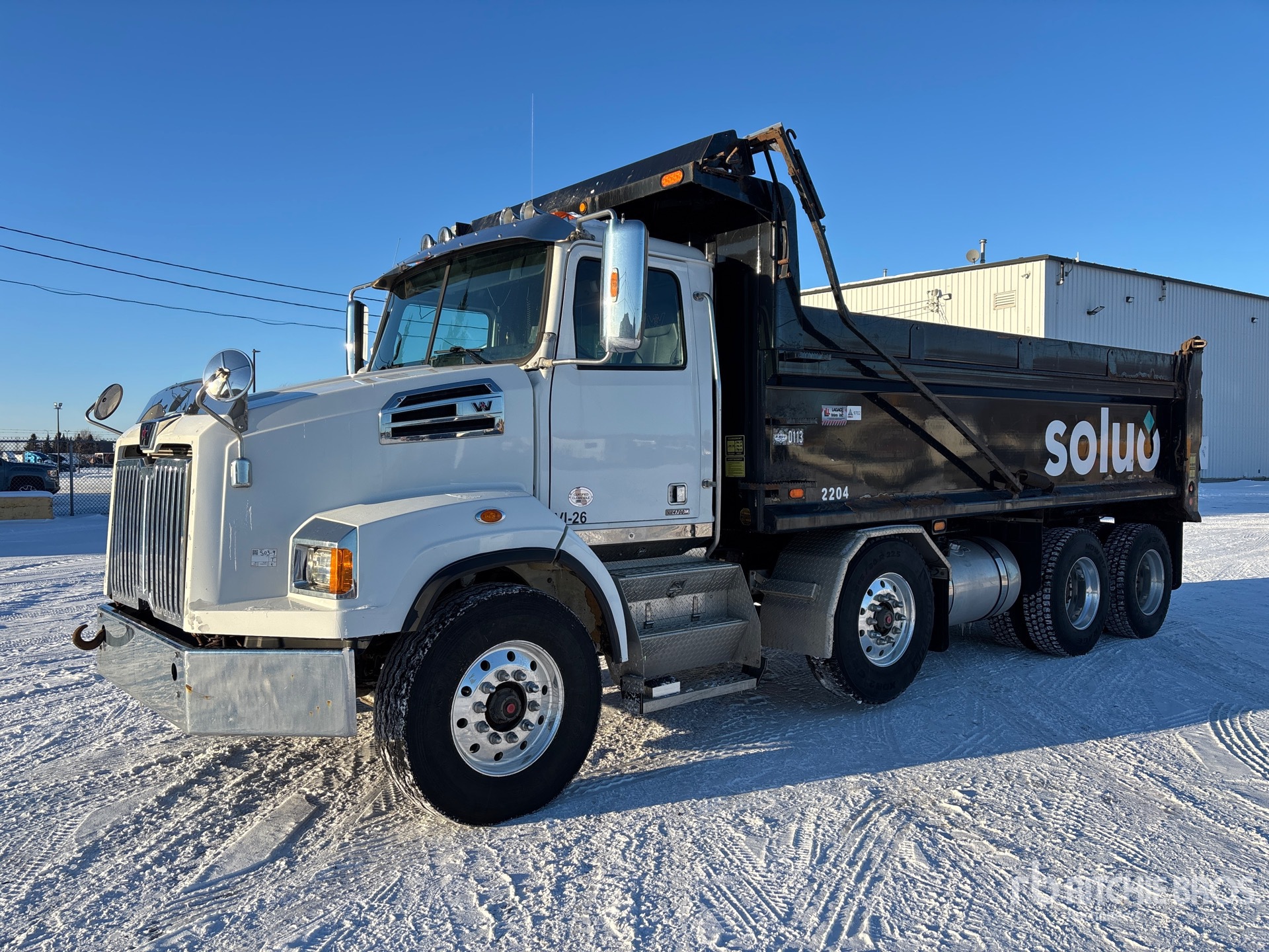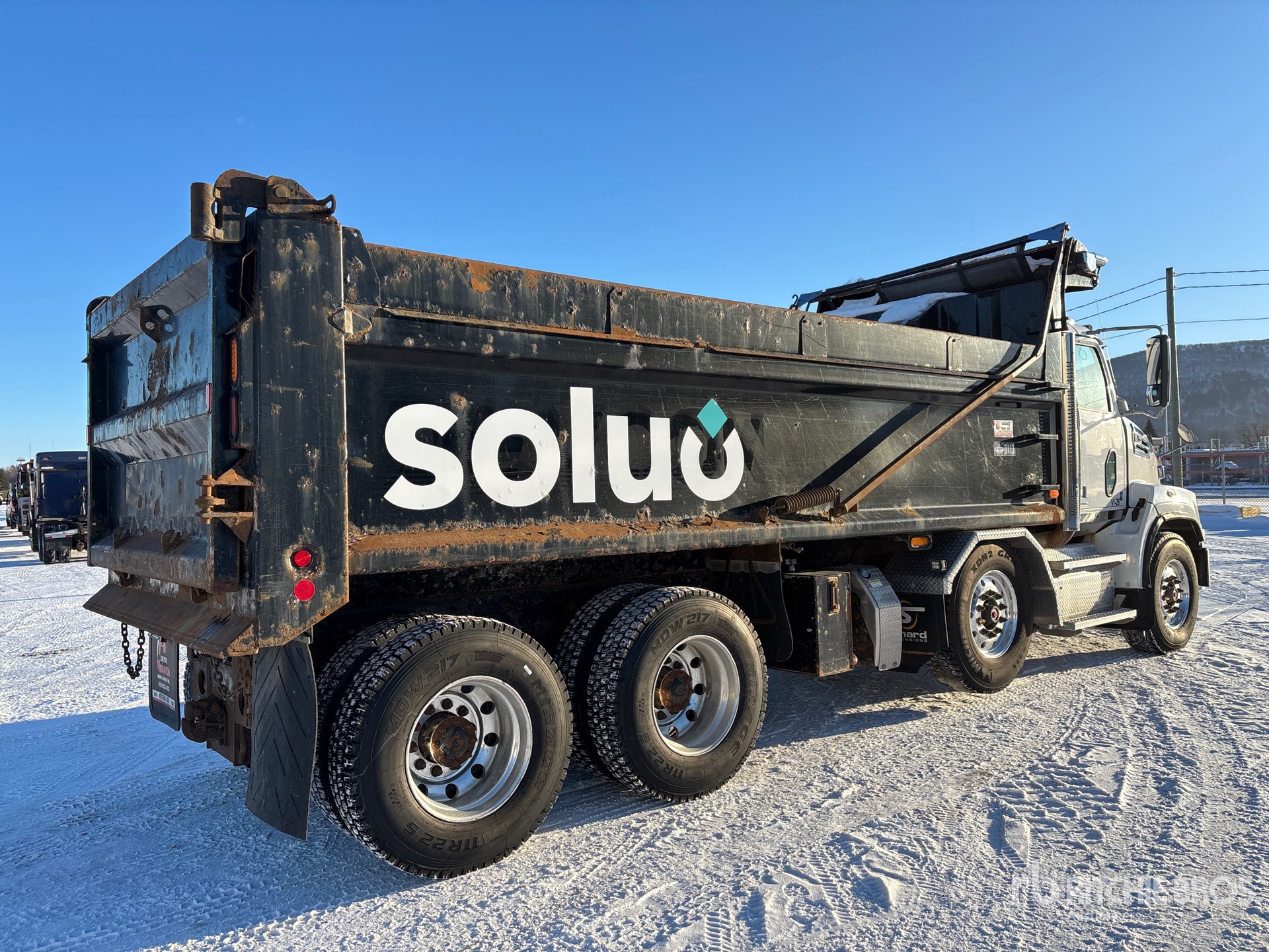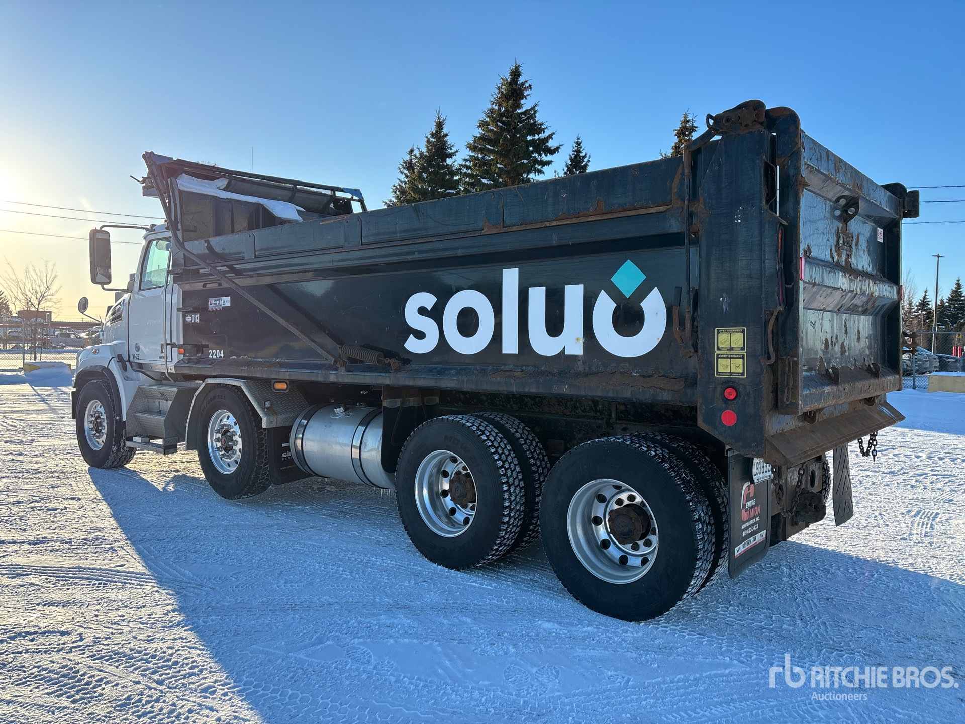 Detroit DD13 6 Cylinder 12.8 L Diesel 470 hp Engine, 2019 US EPA Label, 9056 Engine hrs, Engine Brake, Allison 4500 Automatic Transmission, Double Differential Locks, 36000 lb Front Axle, 46000 lb Rears, 4.30:1 Axle Ratio, 32659 kg GVWR, Air Ride Cab, Aluminum Wheels, 315/80R22.5 Front Tires, 11R22.5 Rear Tires, Dual Steering Boxes, Air Ride Suspension, 243 in Wheelbase, Lagacé 19 ft 6 in Long x 4 ft High Steel Body, Heated Box, Bed Vibrator, Electric Roll Tarp, 2-Way Tailgate, Pintle Hitch