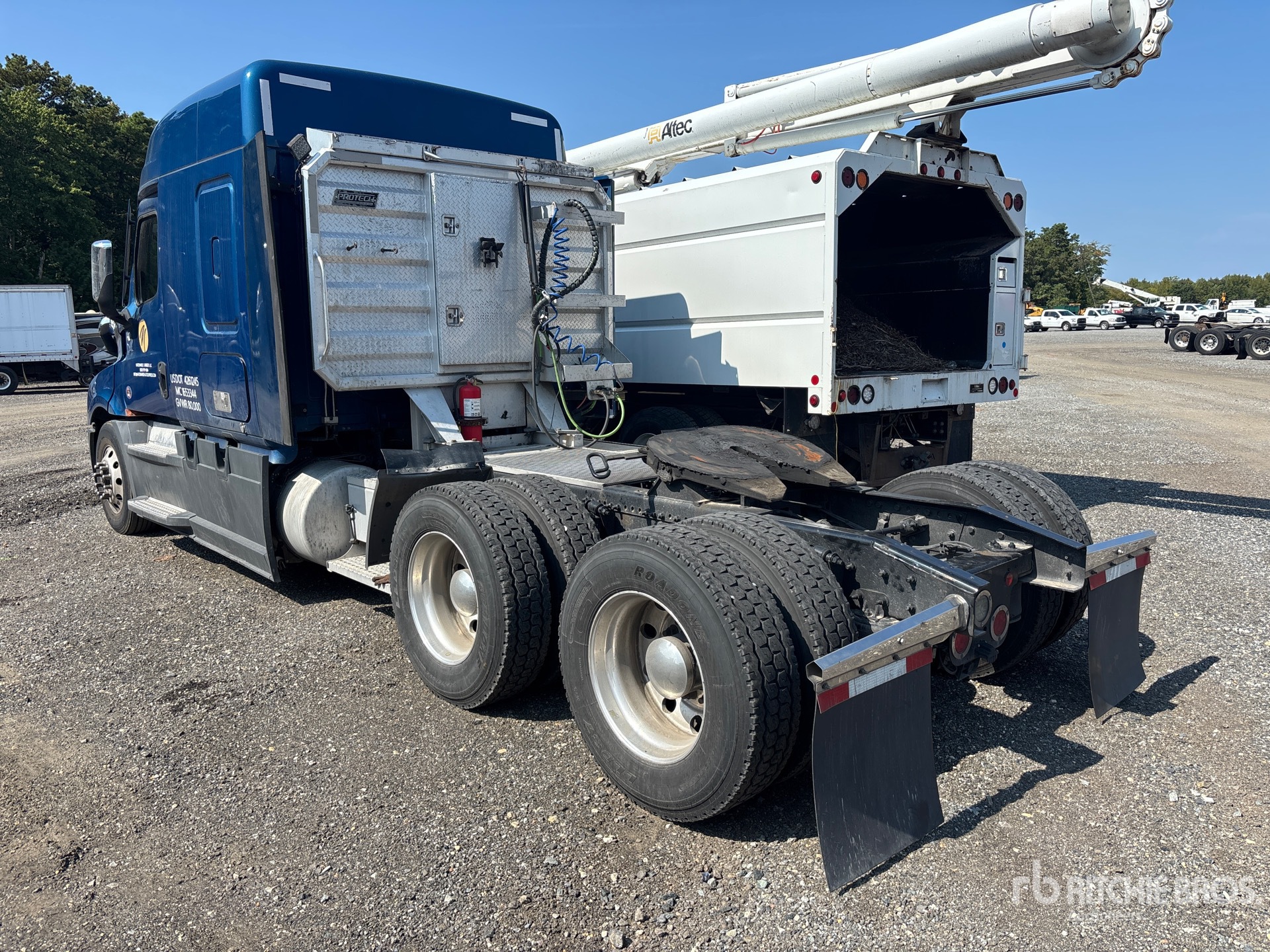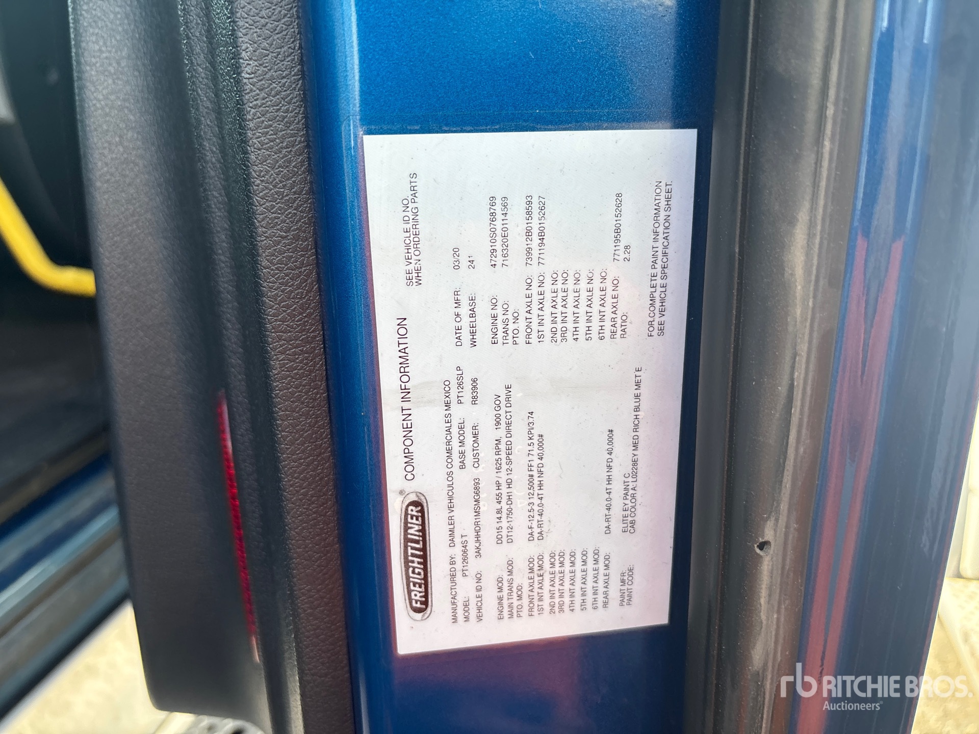 Detroit DD15 455 hp Engine, 2021 US EPA Label, 19687 Engine hrs, Detroit DT12-1750-DH1 12-Speed Automated Transmission, 12500 lb Front Axle, 40000 lb Rears, 52500 lb GVWR, 58 in Mid Roof Sleeper Cab, 241 in Wheelbase, Air Suspension, Aluminum Wheels, 295/75R22.5, Dual Fuel Tanks