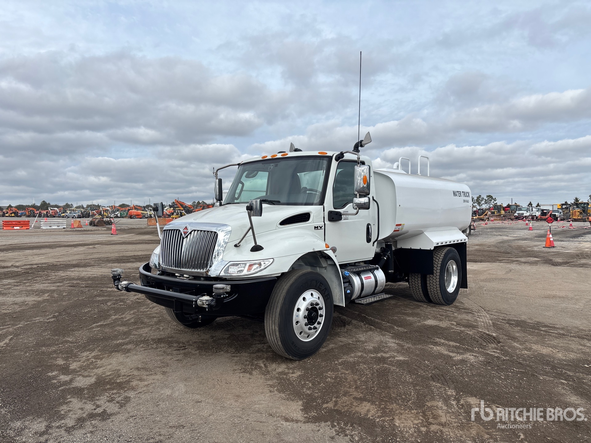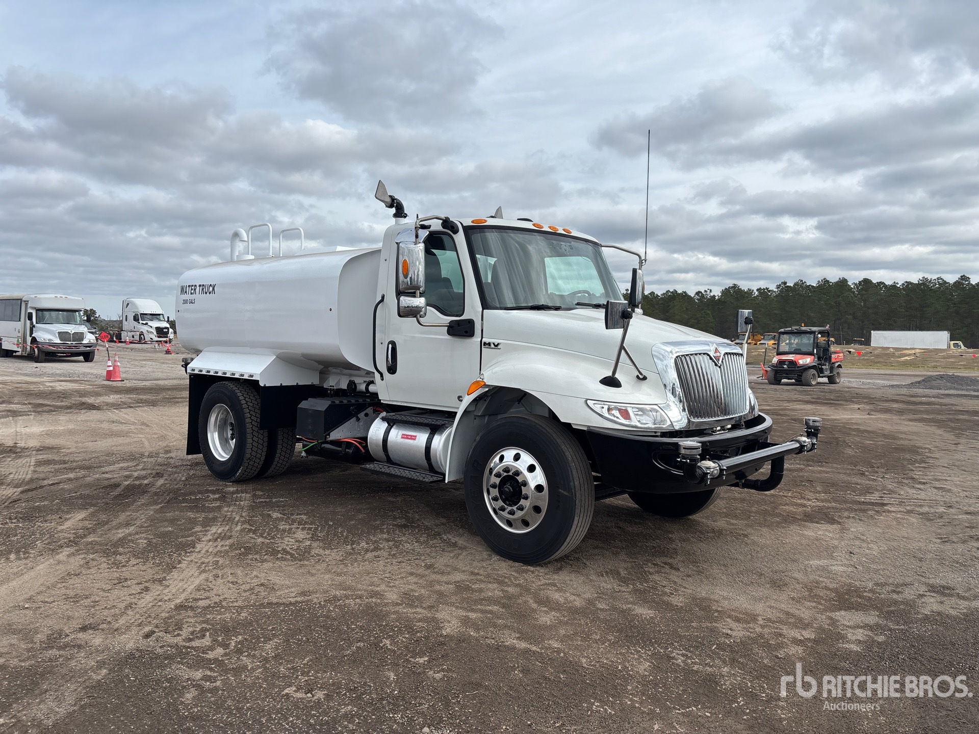 Cummins B6.7 240 6 Cylinder 6.7 L Diesel 240 hp Engine, 2021 US EPA Label, CARB Compliant, Requires Diesel Exhaust Fluid, 5228 Engine hrs, Exhaust Brake, Automatic Transmission, 10000 lb Front Axle, 17500 lb Rears, 25999 lb GVWR, Aluminum Wheels, 11R22.5 Front Tires, 11R22.5 Rear Tires, Air Ride Suspension, 157 in Wheelbase, Lands (Unused) Powder Coated 2000 gal Tank, PTO Driven Pump, 7 ft, Spray Bar, Hose Reel, Front Spray, Rear Spray, Side Spray