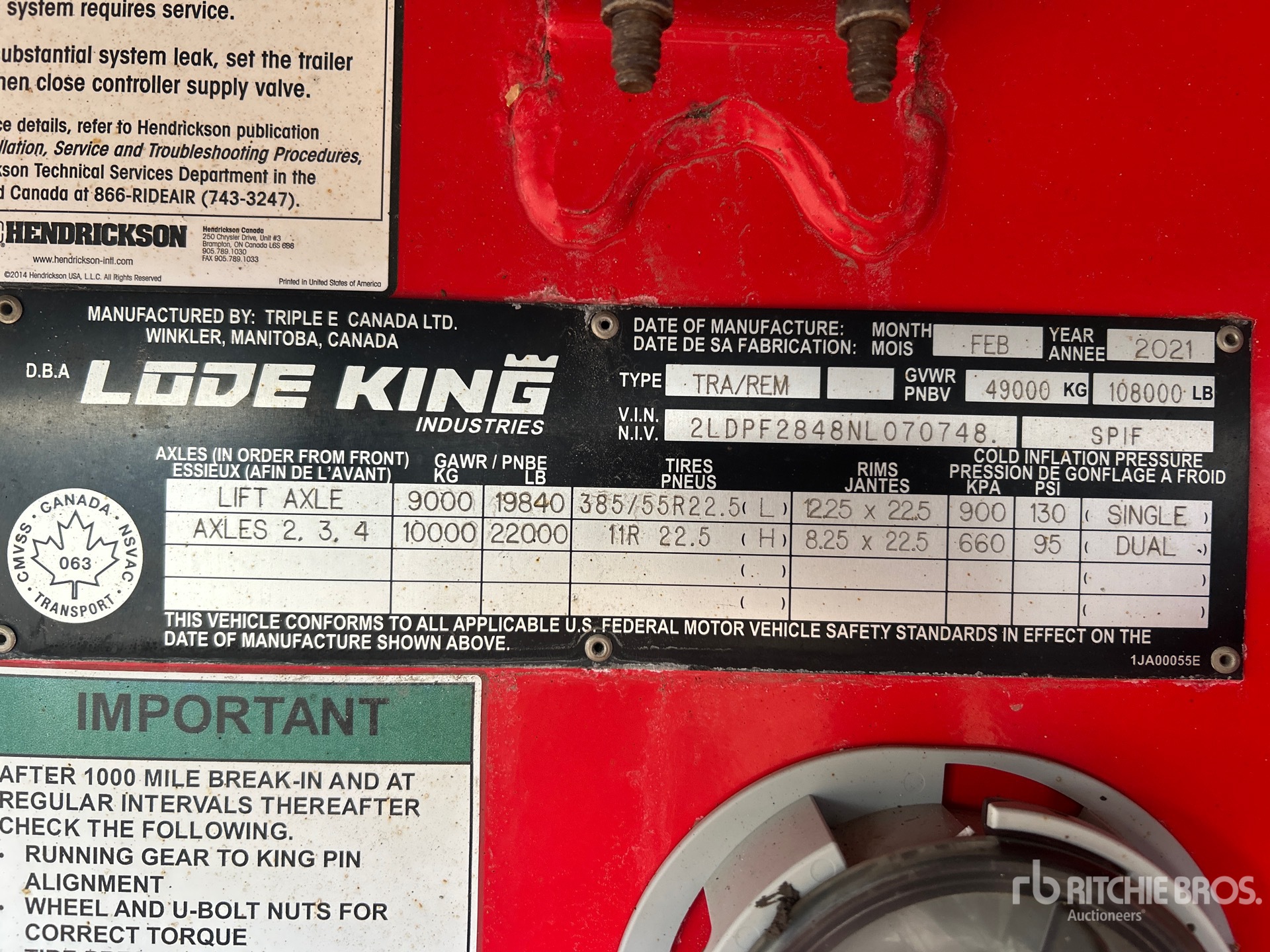 Air Ride Suspension, Air Brakes, Lift 1st- Axles, 97 in Deck Width, 102 in Overall Width, Aluminum w/Wood Strips Flooring, Aluminum Wheels, 11R22.5 Tires, 49000 kg GVWR