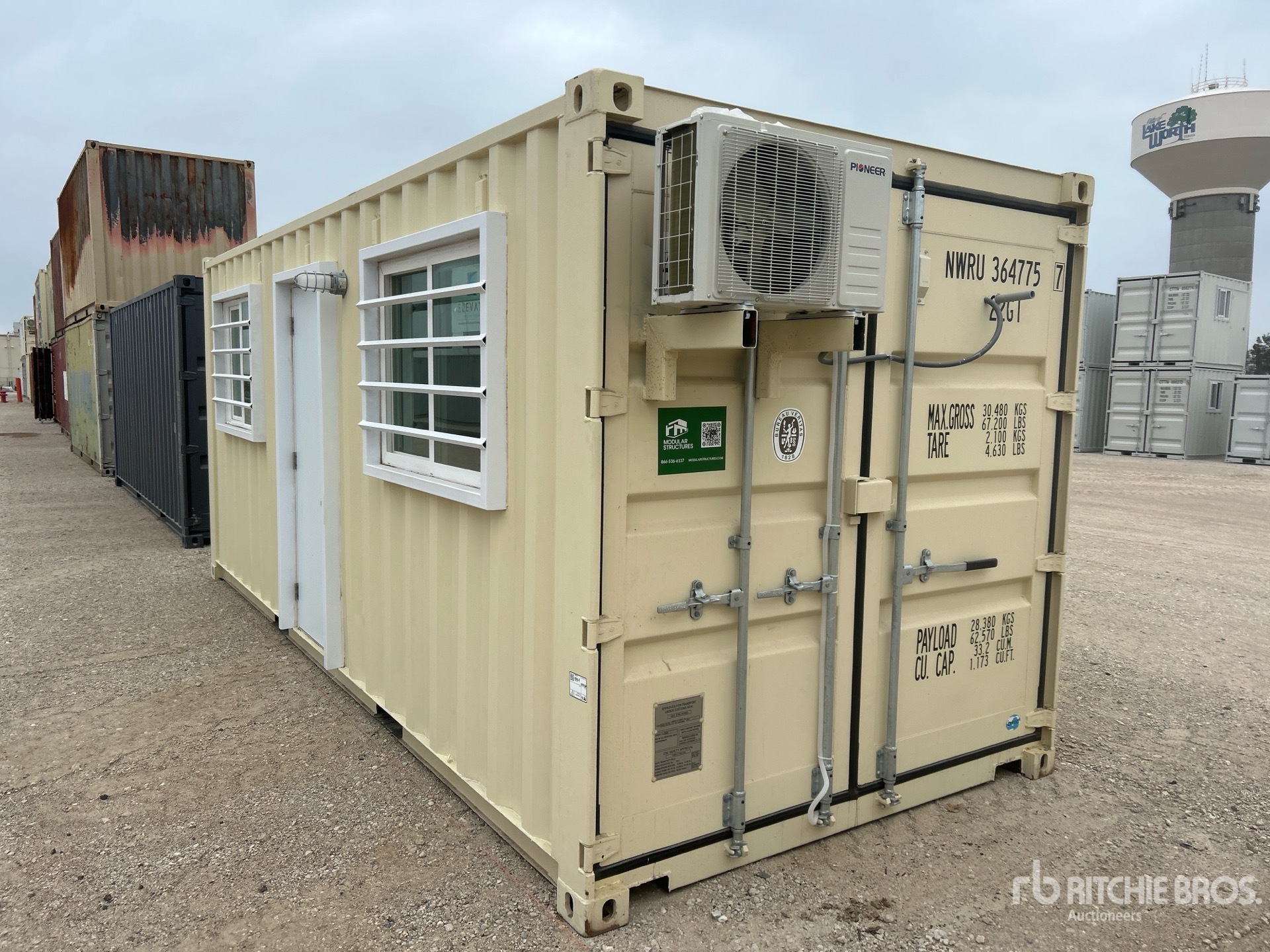 Man Door, Two Windows, 20' x 8', 8' 6" High, (1) Swing-Out Door, (2) Windows w/Security Bars, Fork Pockets, Laminate Flooring, SunScreen, R13 Insulation, (1) Pioneer HVAC Mini-Split, (1) Electric Panel, LED Ceiling Lights, Interior Outlets, Wiring done to National Electric Code (NEC)