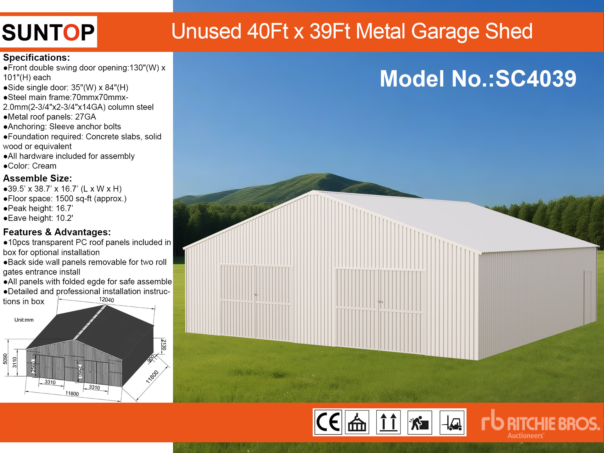Maten worden slechts bij benadering gegeven. De werkelijke afmetingen onder belasting kunnen variëren afhankelijk van de hoogte van de vrachtwagen/aanhanger en de configuratie/positie van de geladen machine. Het is de verantwoordelijkheid van de koper om alle ladingen te meten voordat deze onze veilinglocatie verlaten, om te garanderen dat de lading veilig is voor transport. Alle maten moeten door de koper worden gecontroleerd. Vertrouw niet op deze maten voor transportdoeleinden.
