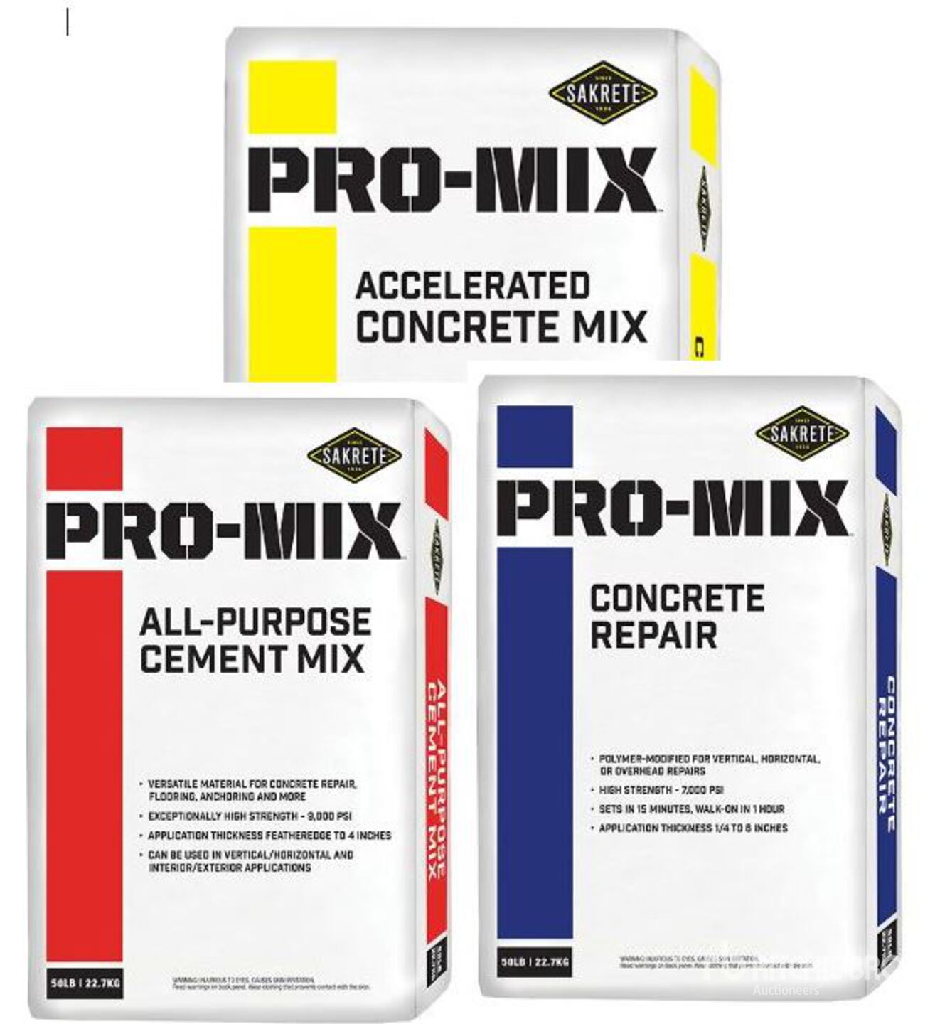 5 pallets each of Pro Mix Accelerated Concrete Mix: 4000 PSI at 3 hours, 6000 PSI 28 days; 15 minute set time; Exceeds ASTM C387; Excellent workability; Model #65200651, 30/pallet. Pro Mix All Purpose Cement: >3000 PSI 1hour, >4000 PSI 3 hours, >9000 PSI 28 days; 15 minute set time, 1 hour walk on time; Meets ASTM C938; Formulated for smooth workability and shrink compensation; Model #65450047, 30/pallet. Pro Mix Concrete Repair: >3000 PSI 1hour, >4000 PSI 3 hours, >7000 PSI 28 day; 15 minute set time, <1 hour for foot traffic; Meets ASTM C938; Polymer modified for smooth workability and bond strength; Model #65450044, 30/pallet. Shipping not included. Must claim by 7/31/26.