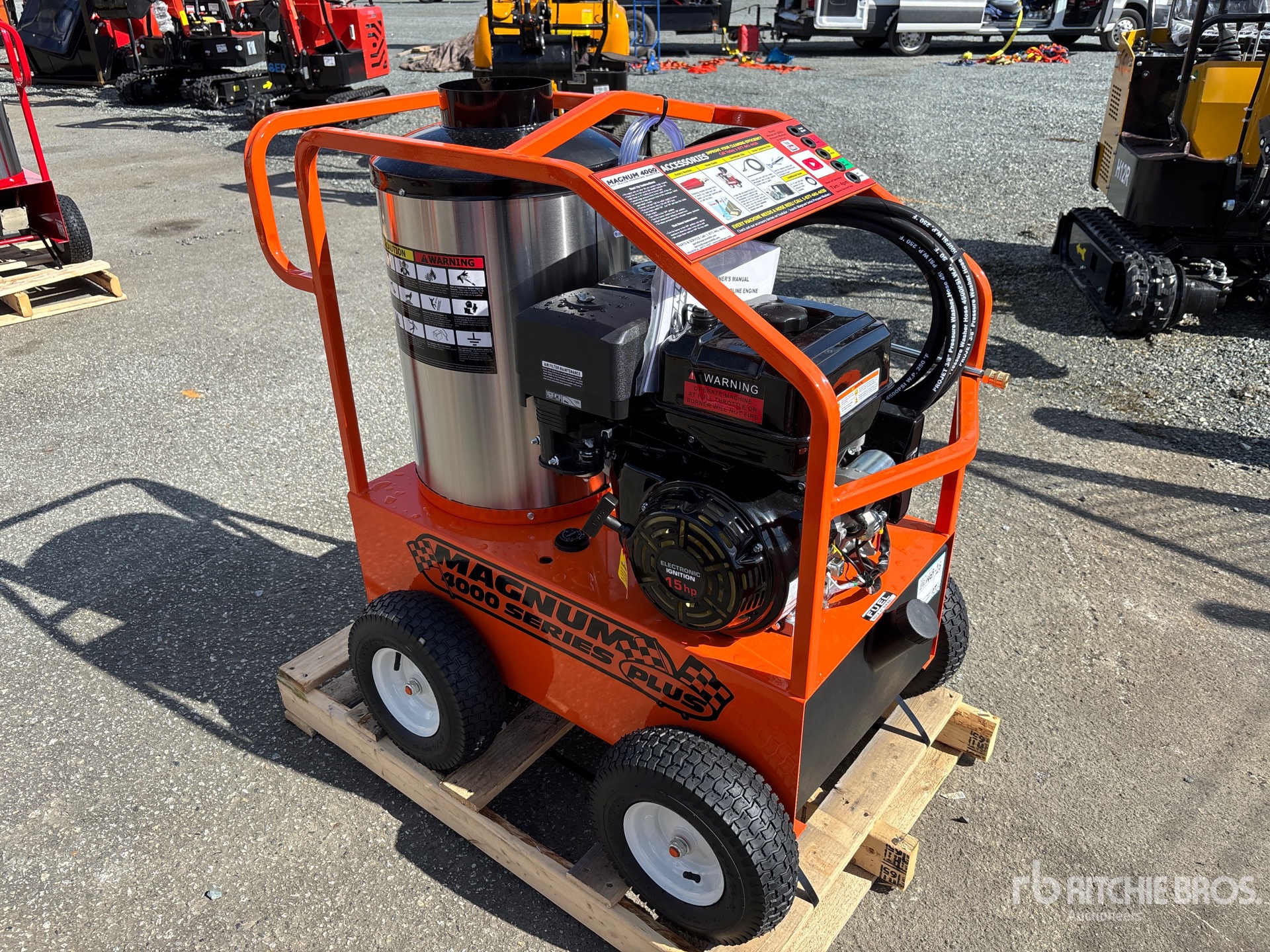 4000 psi Rating, Water Heater, Hose, Spray Wand, 15 hp 420 cc Gasoline Engine, Product images displayed are stock photos. Item is new/unused.