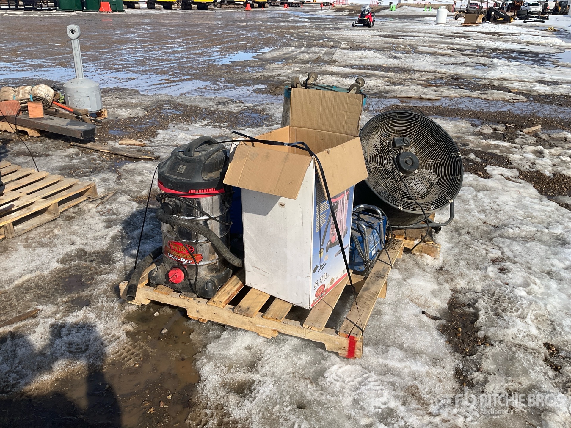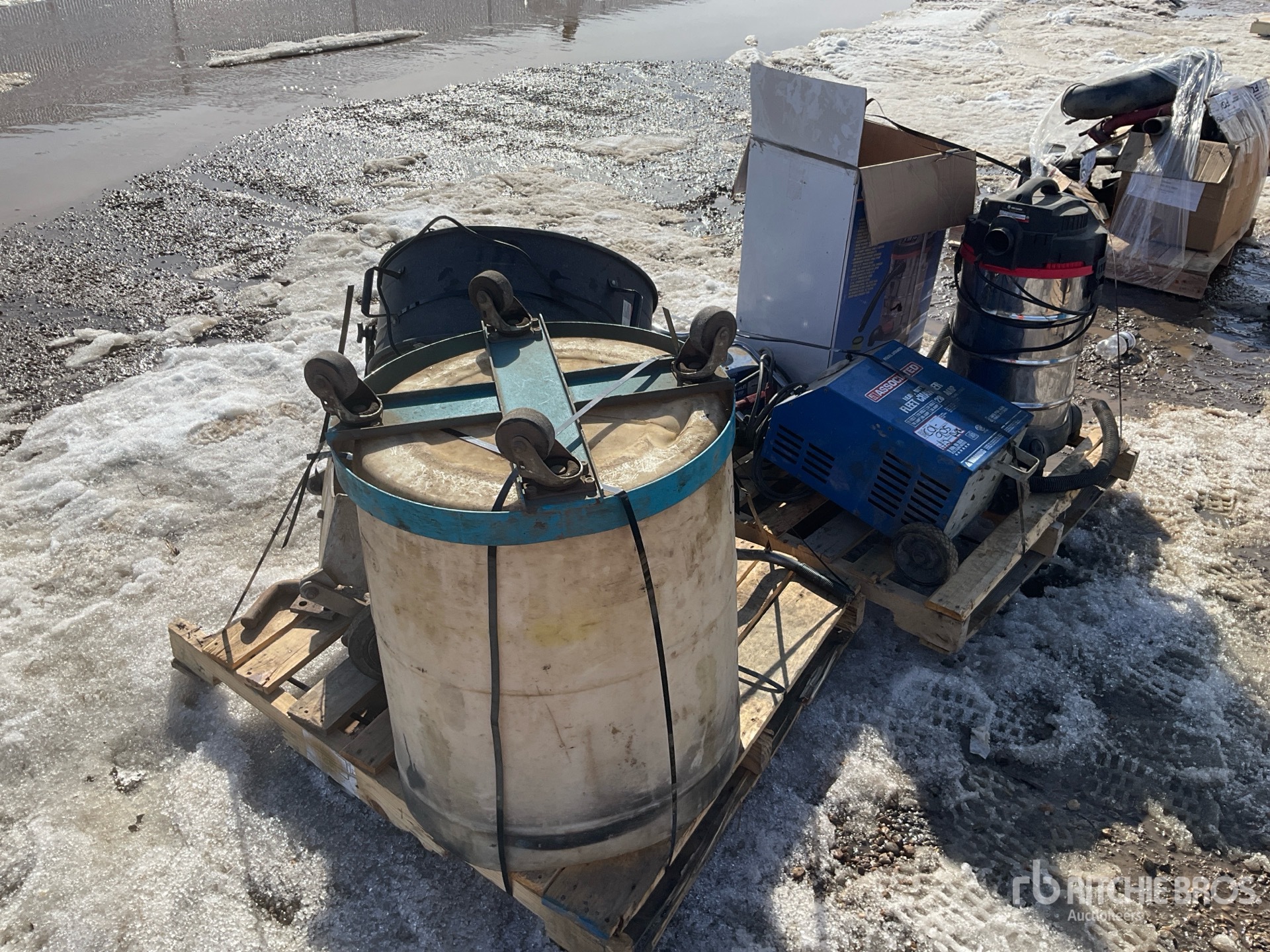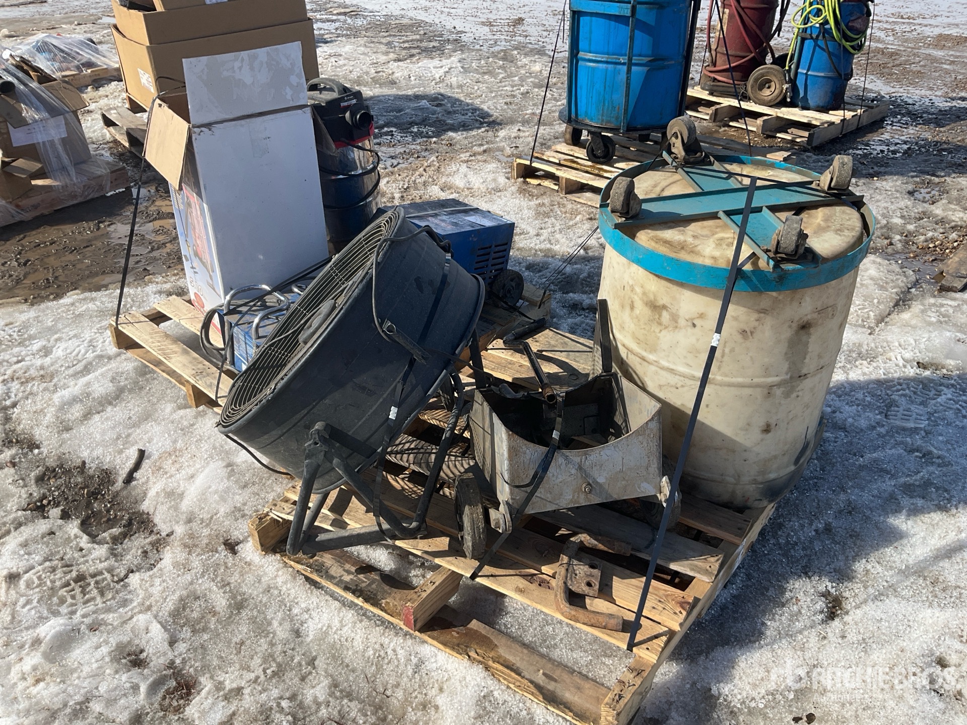 Battery charger, shop vac, fan, plastic drum